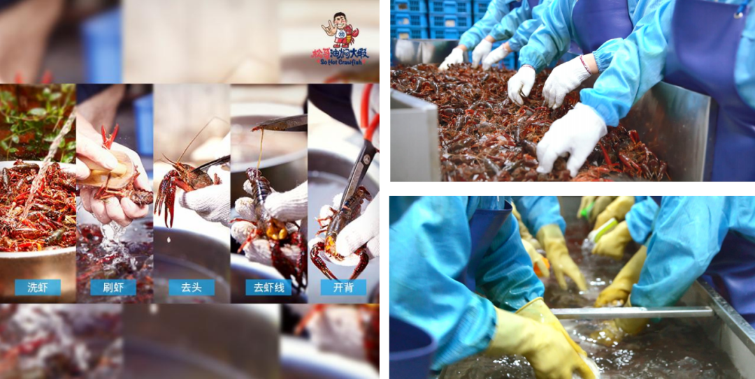 为追求极致口感,松哥还斥资组建手工刷虾大妈天团,一年光付给手工刷虾大妈的人工费用就高达数百万元。每只小龙虾的清洗必须按照9道清洁工序,剪头剪尾去虾线,一步都不能少。
