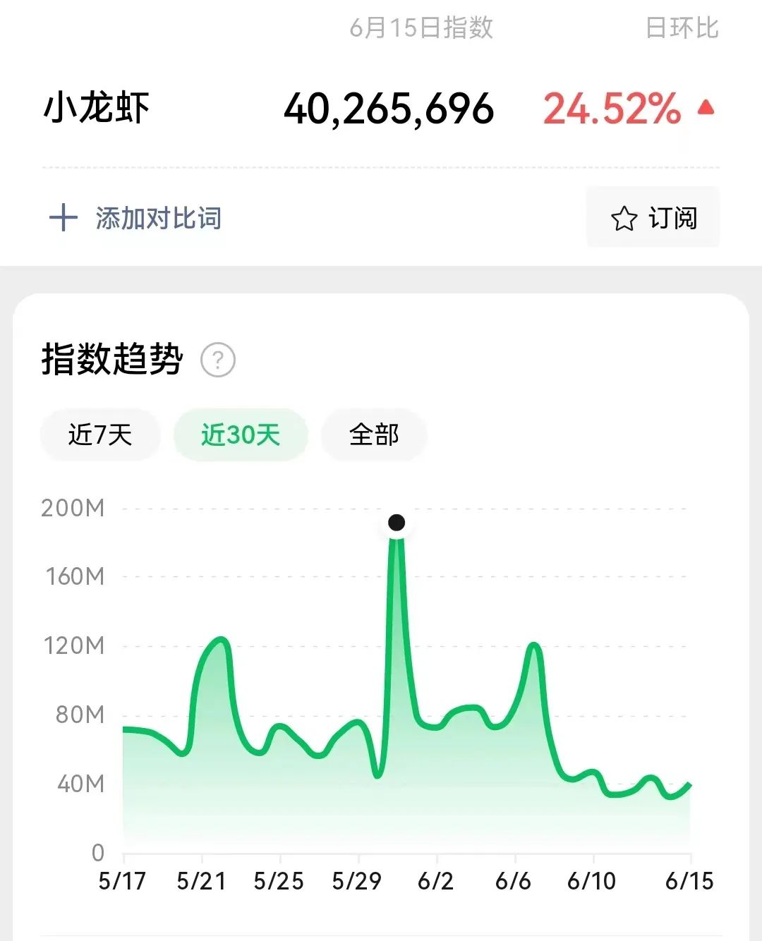 根据微信指数显示,自2022年4月份左右后,“小龙虾”关键词搜索量环比暴增,已成为时下最火爆的话题之一。最高日搜索量可达2亿人次。