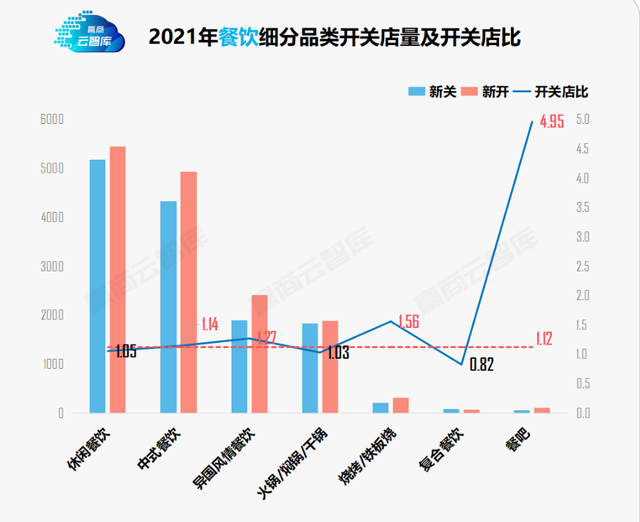 根据赢商网大数据显示,2021年,餐饮整体开关店比1.12,呈现小幅扩张。除复合餐饮开关店比小于1外,其余细分品类均大于1;“微醺经济”带动下,餐吧开关店比甚至达4.95。