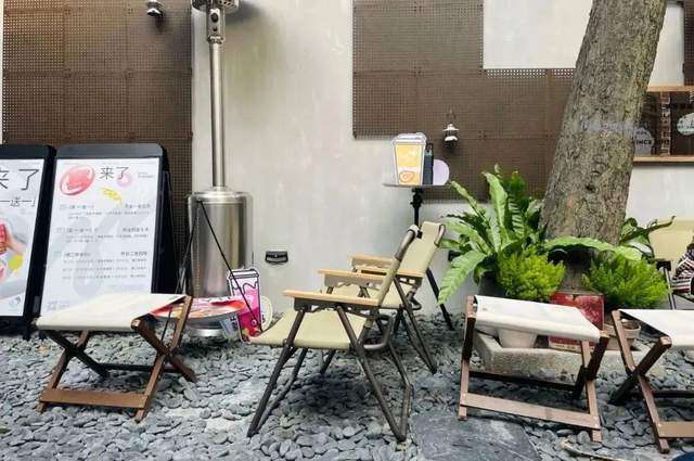 在店铺的院子内,喜茶打造了时下最热的露营风客座区,露营灯、蛋卷桌、克米特椅等露营设备,顾客可以边喝茶边体验城市露营。