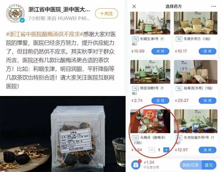 浙江省中医院是这款酸梅汤爆火的发源地,9月6日据相关负责人表示,“线上茶饮3天卖出20多万帖,比平时增加10倍以上,有人一次买走99包。服务器都被挤爆了。”酸梅汤已售罄了,正多方努力提升供应量以及互联网医院服务器能力。