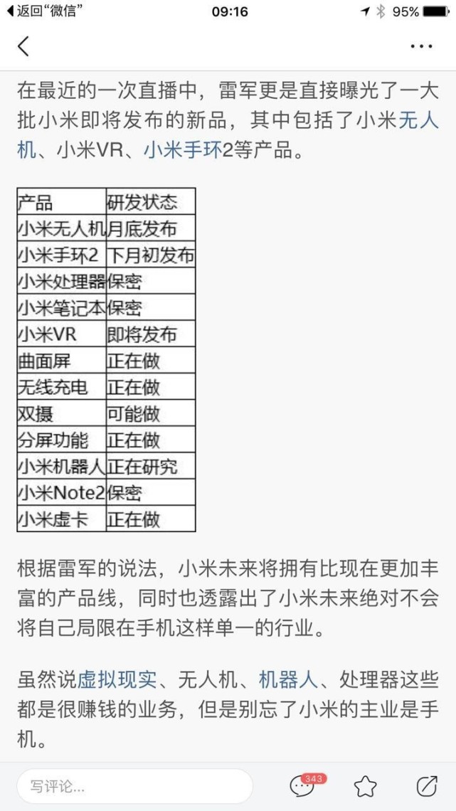 最近的一次直播中,雷军曝光了一大批小米即将发布的新品,其中包括了小米无人机、小米VR、小米手环2等产品。其中最引入注目的其实是小米的曲面屏手机,这才是最近半年,OPPO和VIVO销量超越小米的关键产品。如果再迟了,恐怕新一轮换机的机会,又跑了。