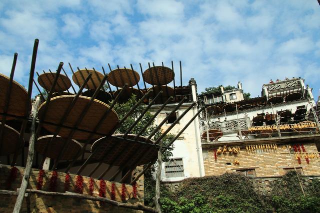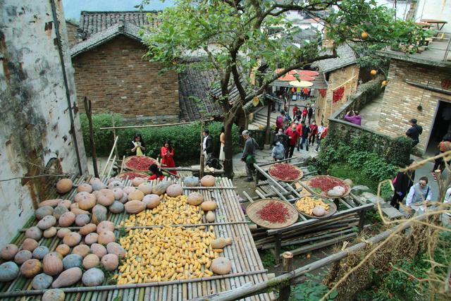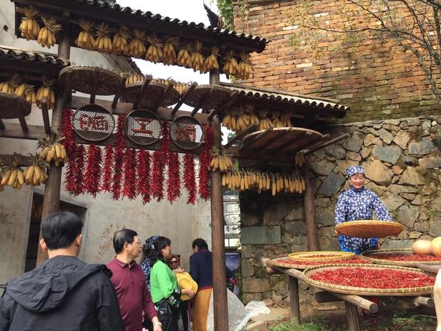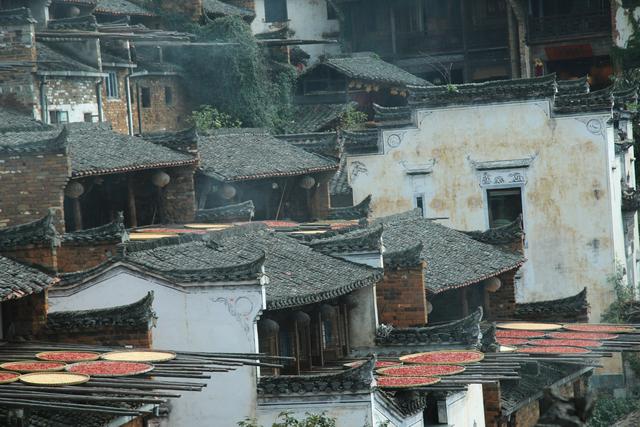 这个时节的篁岭,游客非常多。山腰的篁岭古村,商户鳞次栉比,游客摩肩接踵。家家户户撑出一根根晒架,上面放着一块块圆圆的晒匾,各种地里长出的果实晒在竹匾上。晾晒的农作物有的还被摆成了文字或图画造型,成为游客排队拍照的热点。
