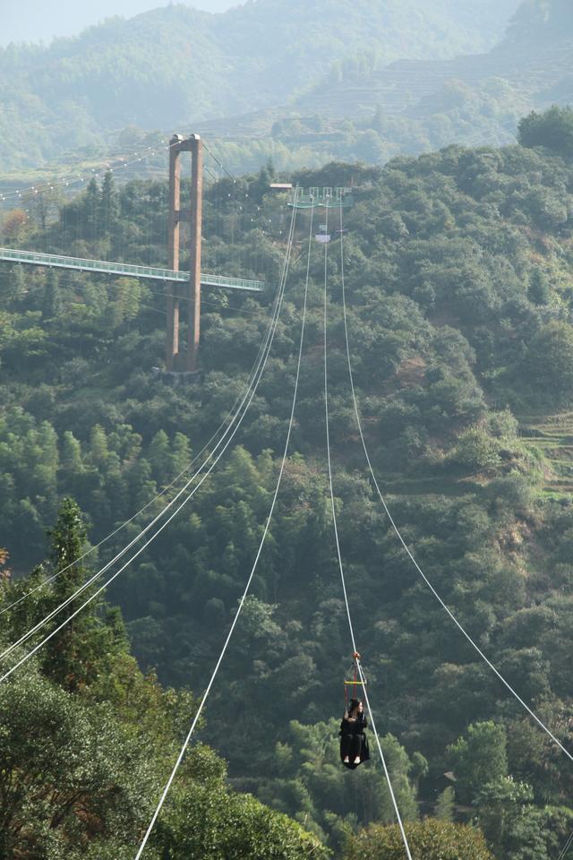 垒心桥:悬挂在篁岭古村的两座山之间,这里是电视剧《欢乐颂2》的取景地,可以在桥上看到山下的“大地之心”。垒心桥距地面垂直高度达97米,中间段48米铺设玻璃。虽然站在玻璃桥面向下俯瞰,山林风景尽收眼底,但胆小者站在上面无法挪步,胆大者却做出各种姿势拍照。更有胆大者喜欢挑战垒心桥旁的疾速溜索,从山那头俯冲而下。