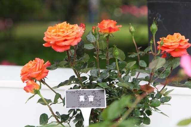 北面月季雕塑广场的阶梯展架上,摆放着“莫奈”“蒙娜丽莎”“奥秘”“赫克托”“橘色火焰”“阳光浪漫”“蜜蜂”“果汁阳台”等30余种月季,据说这些都是值得探访的“花中皇后”。