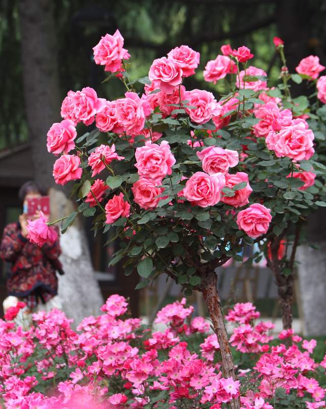 一进门,左右两边是50多株花瓣巨大的树状月季“粉扇”“绯扇”。进入园内,有黄色的大花藤本月季“印象派”、婉约娇羞的红色藤本月季“小女孩”,还有丰花月季“红从容”“黄从容”“仙境”及姿态飘逸的“小桃红”“杏花村”等月季。