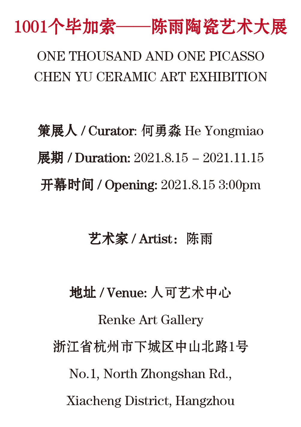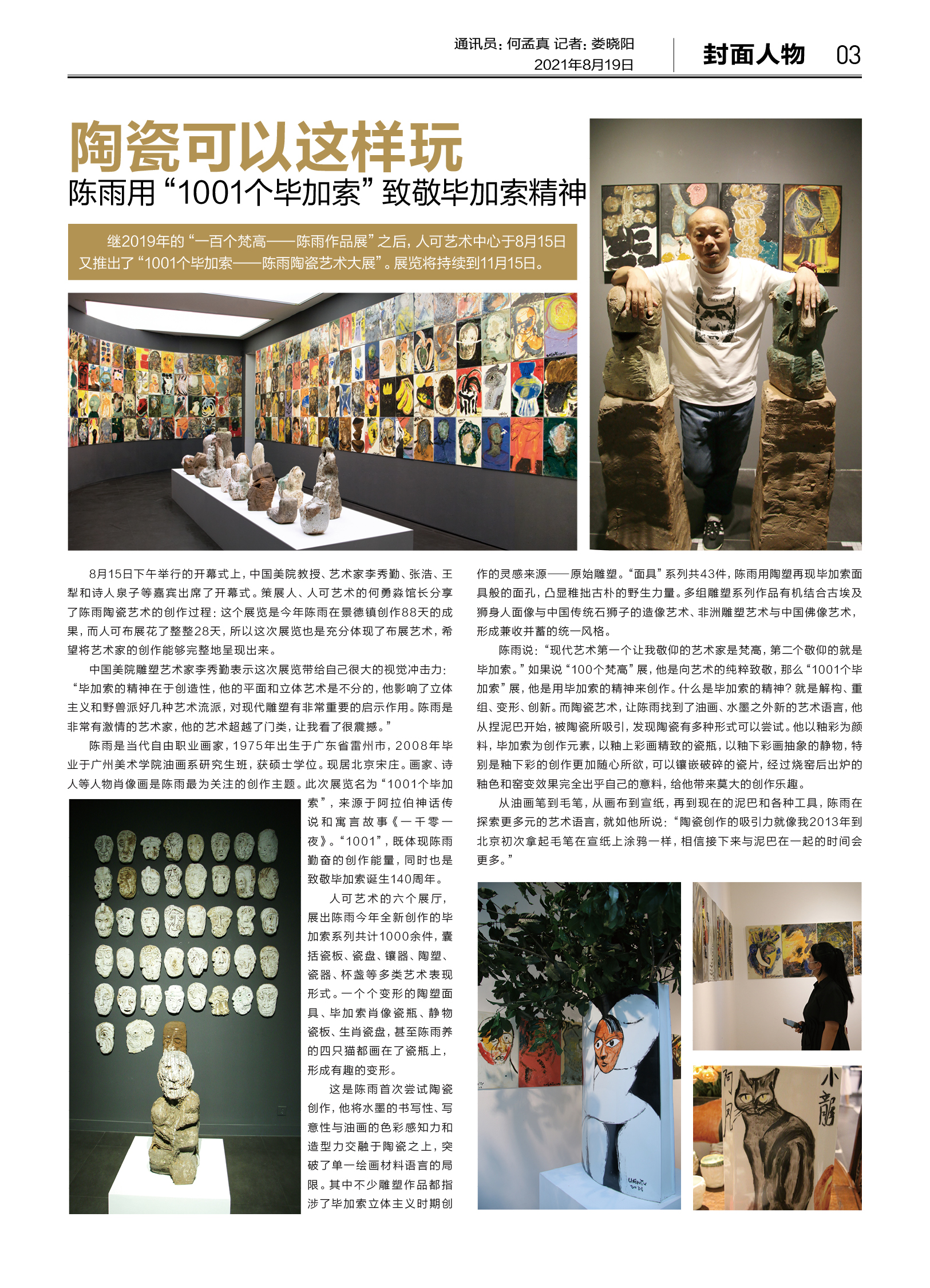 继2019年的“一百个梵高——陈雨作品展”之后,人可艺术中心于8月15日又推出了“1001个毕加索——陈雨陶瓷艺术大展”。展览将持续到11月15日。