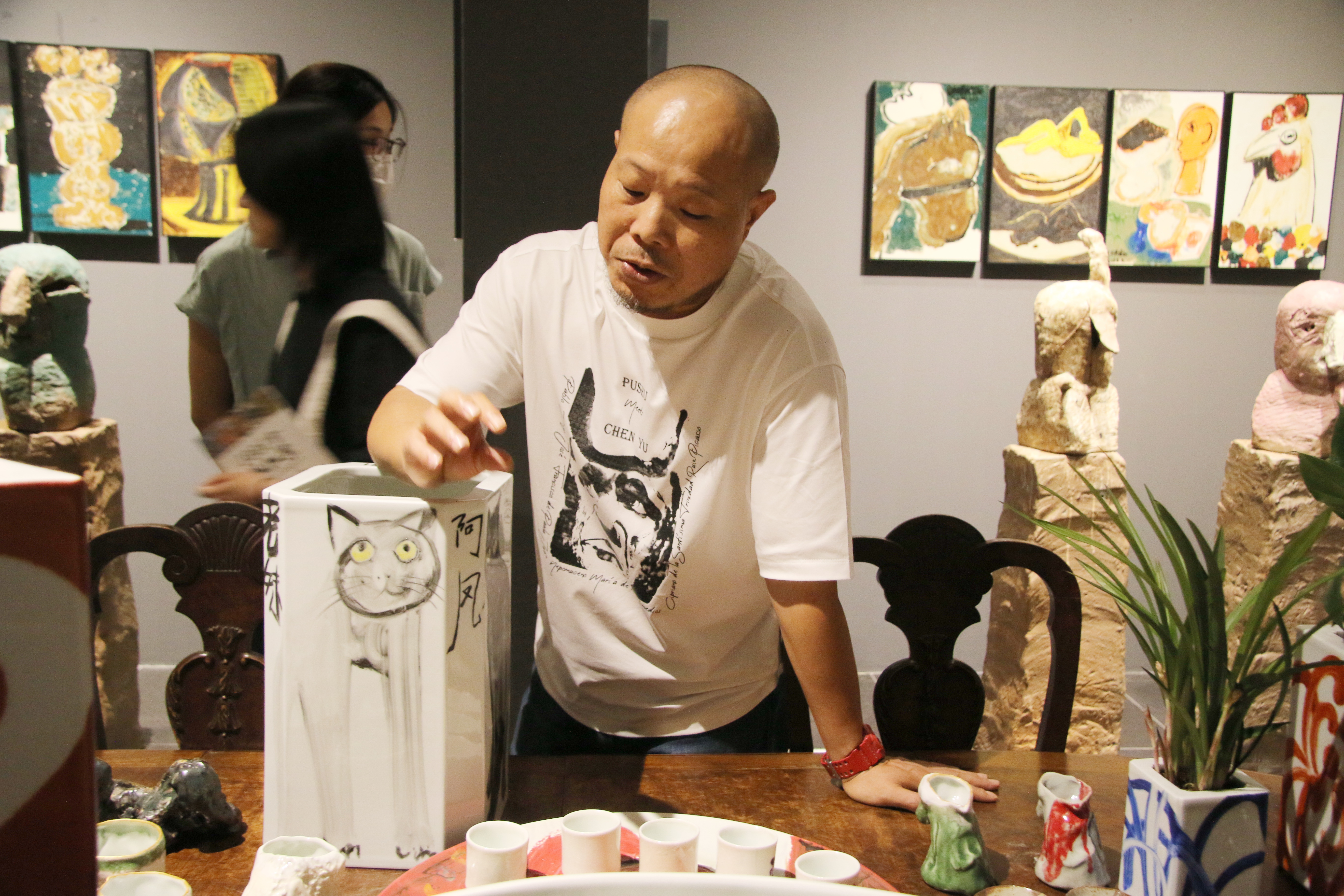 8月15日下午举行的开幕式上,中国美院教授、艺术家李秀勤、张浩、王犁和诗人泉子等嘉宾出席了开幕式。策展人、人可艺术的何勇淼馆长分享了陈雨陶瓷艺术的创作过程:这个展览是陈雨在景德镇创作88天的结果,而人可布展花了28天,所以这次展览也是充分体现了布展艺术,希望将艺术家的创作能够完整地呈现出来。