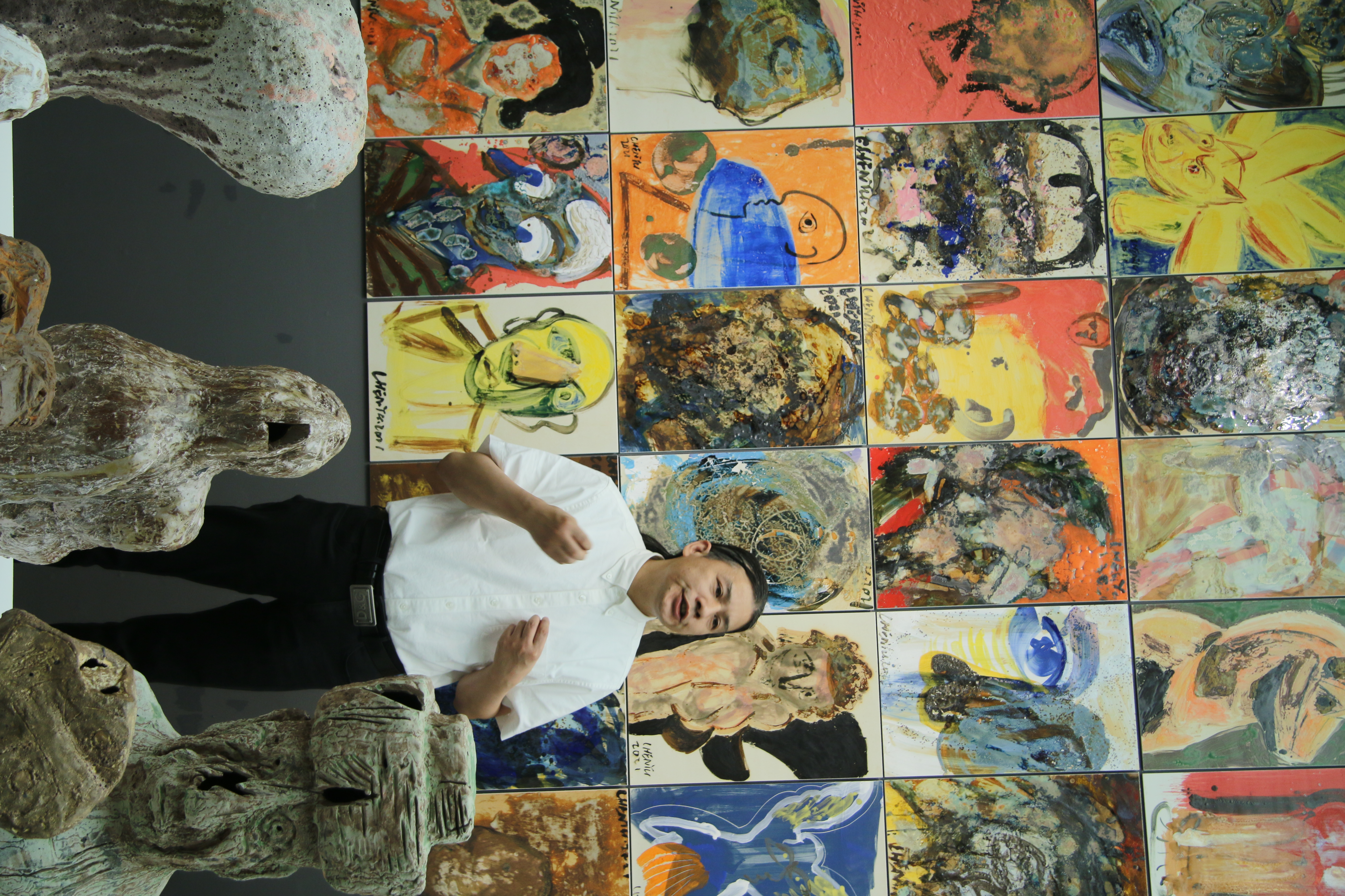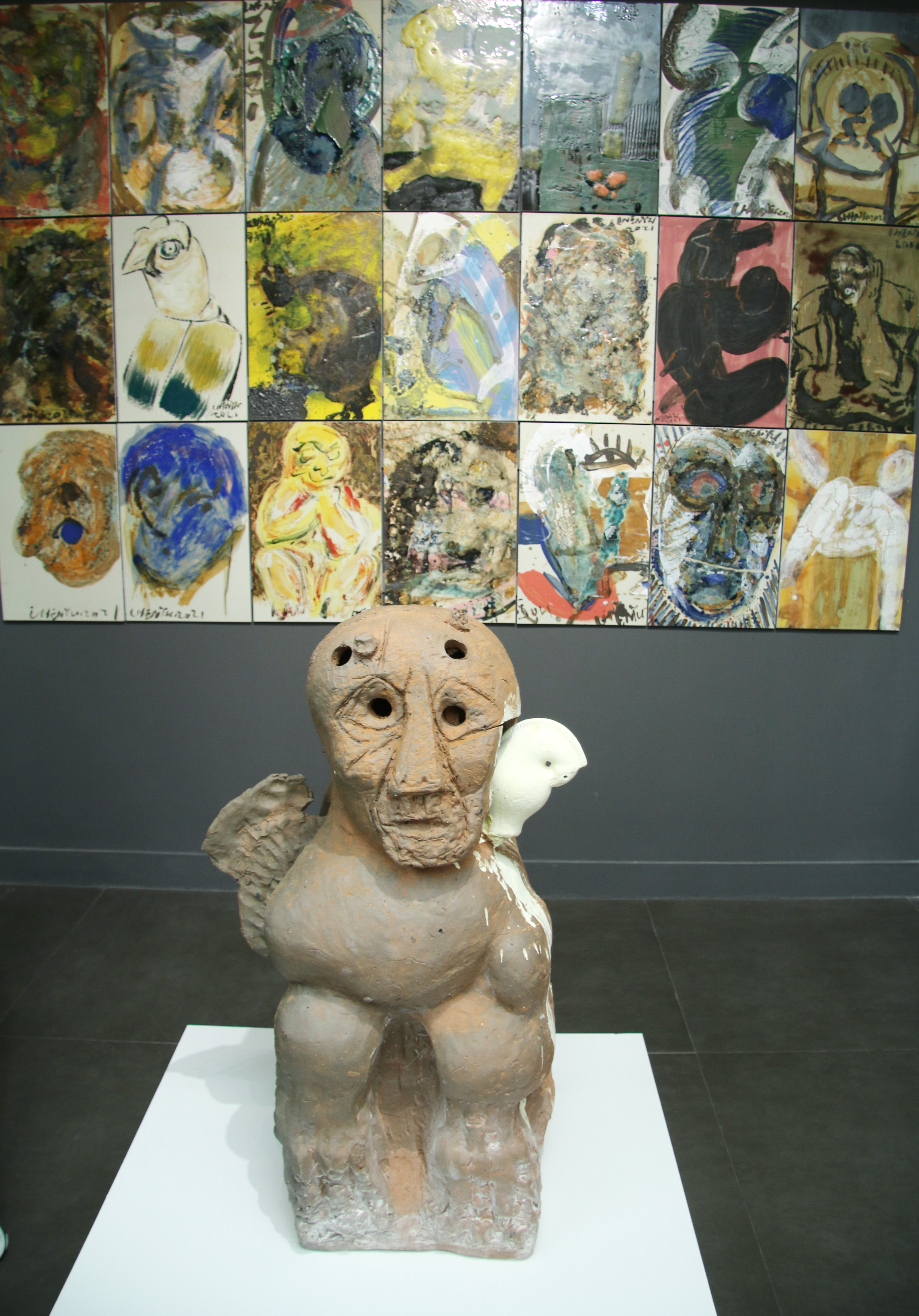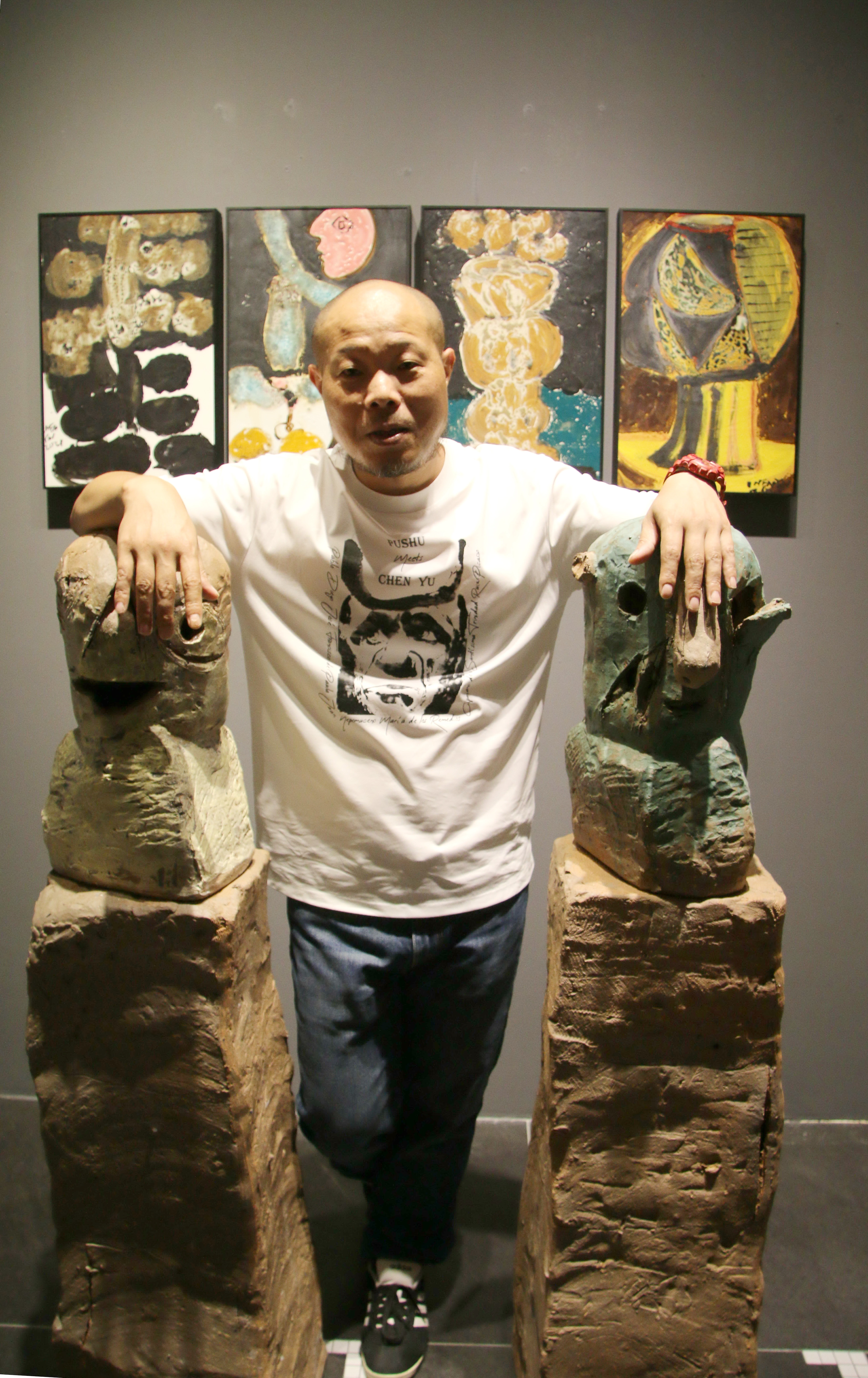 这次的陶瓷艺术大展,是陈雨在近六年的艺术实践中,将水墨的书写性、写意性与油画的色彩感知力和造型力交融于陶瓷之上,突破了单一绘画材料语言的局限。其中不少雕塑作品都指涉了毕加索立体主义时期创作的灵感来源——原始雕塑。“面具”系列共43件,陈雨用陶塑再现毕加索面具般的面孔,凸显稚拙古朴的野生力量。多组雕塑系列作品有机结合古埃及狮身人面像与中国传统石狮子的造像艺术、非洲雕塑艺术与中国佛像艺术,形成兼收并蓄的统一风格。