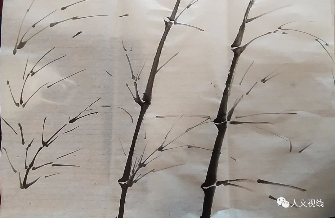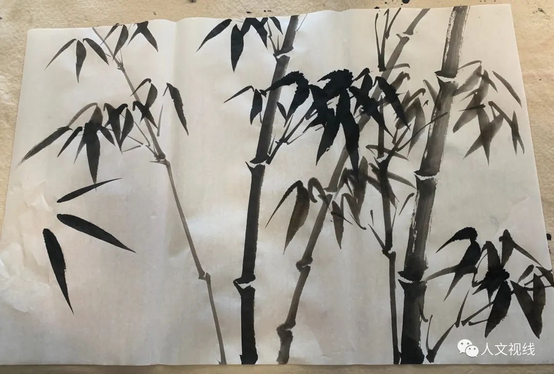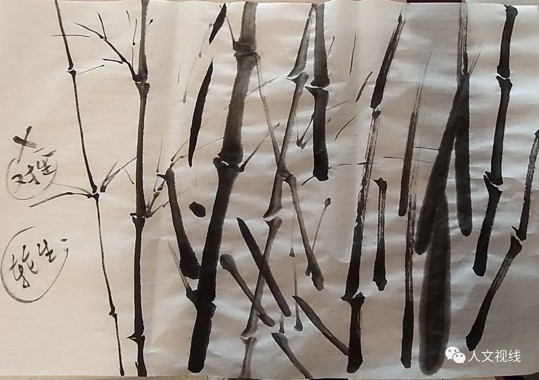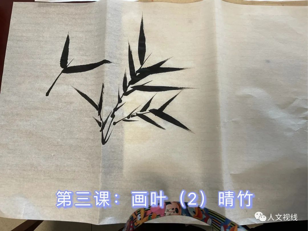 有句话说:半世竹一世兰。先学习画竹竿,给每个人都画了一幅竹竿,上课练习,回去再练,以后每次课都要带作业,并带笔墨在课上练习。