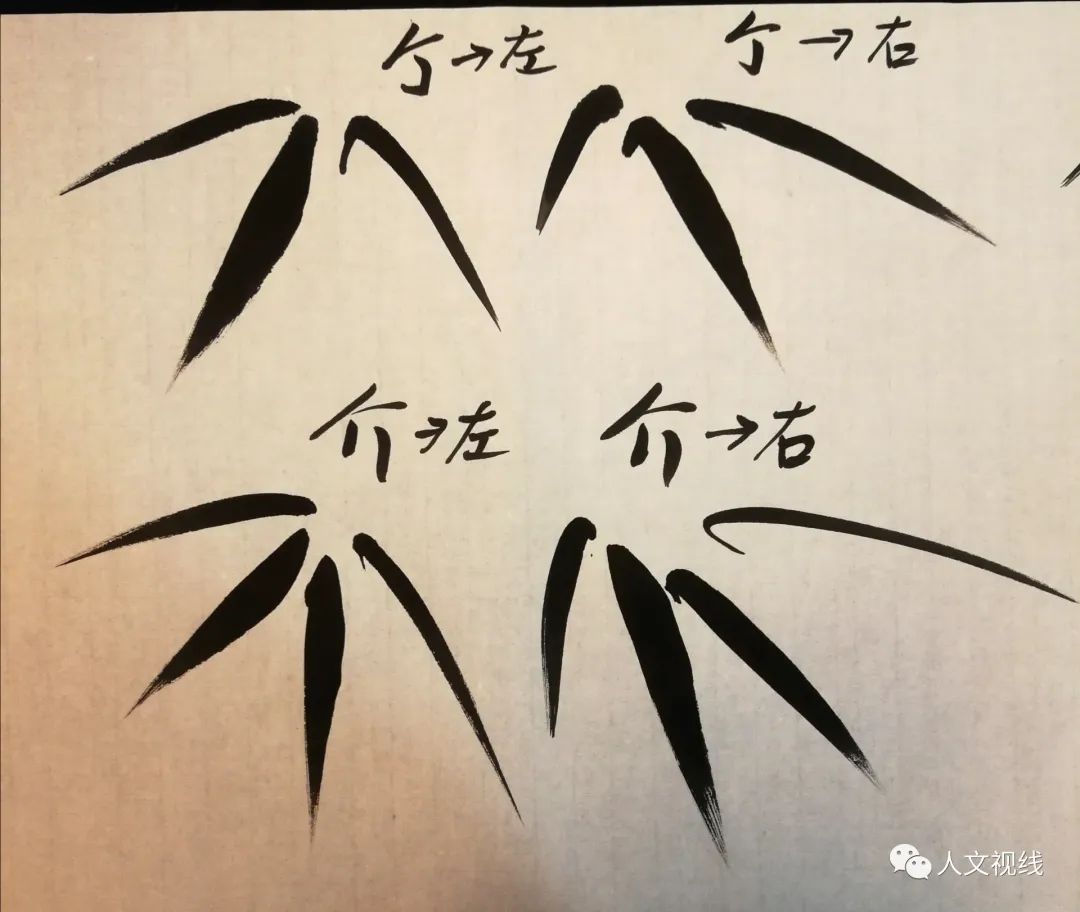 竹枝的头上要画得越来越细。竹叶是介字和个字的组合。