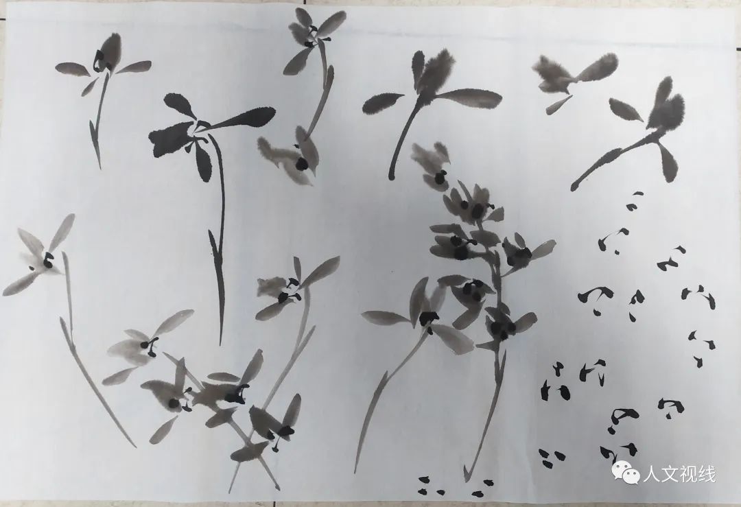 注意墨色变化,浓淡结合,笔尖蘸墨,用完再蘸墨。画花的时候笔尖蘸水。一笔的气要送到底。