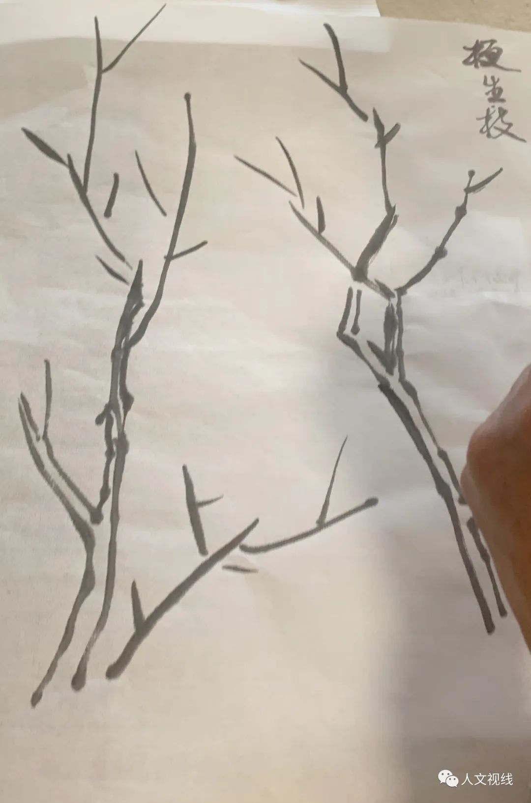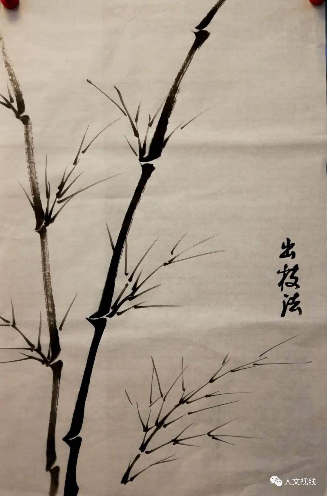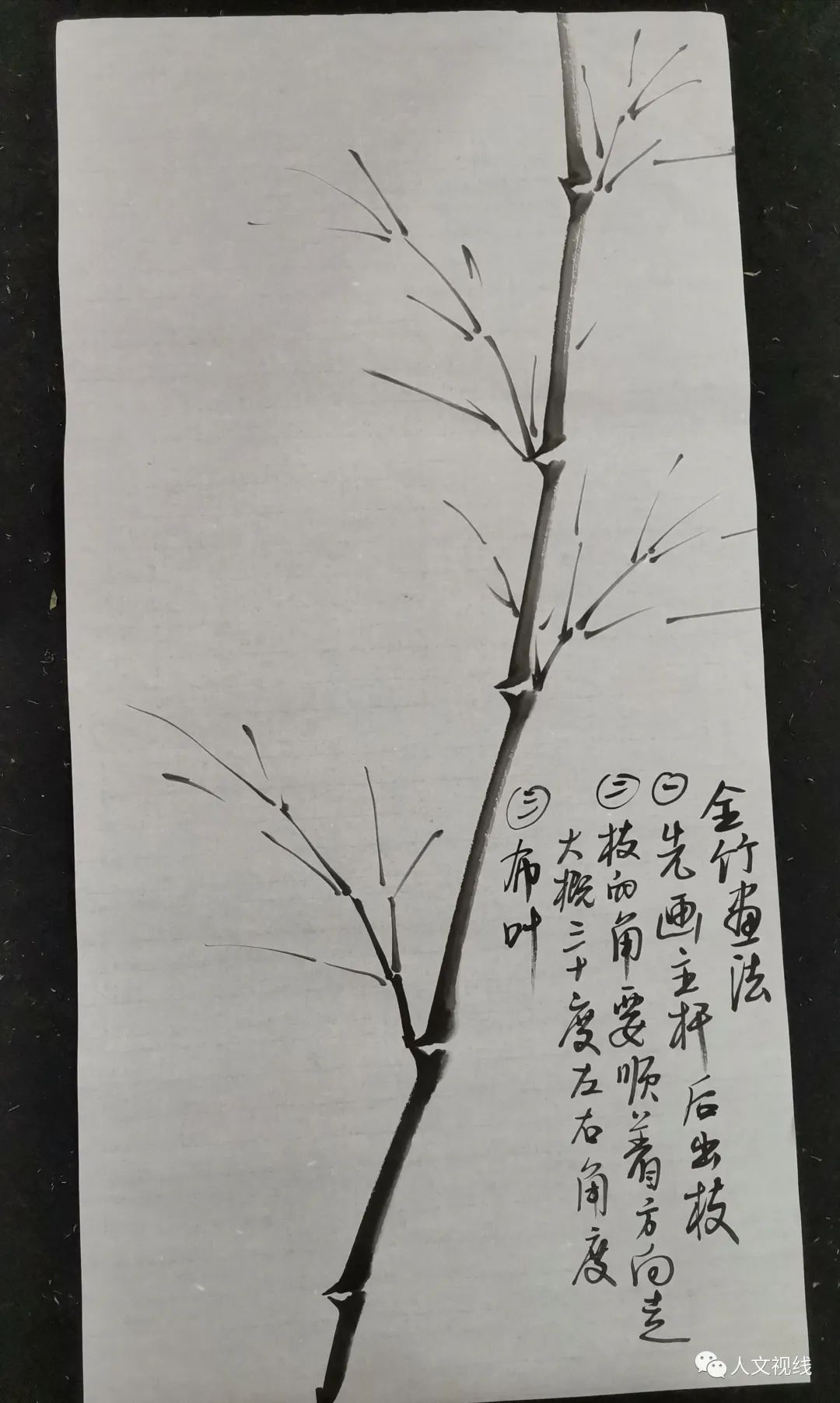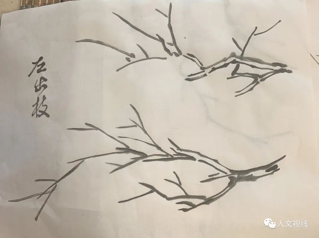练出枝,和画竹竿一样,鹿角,左右交叉出枝叫轮生,不能画同一个竹节上的对生。顺着主干30度角向上,要出在竹节上。小枝条可以对生。