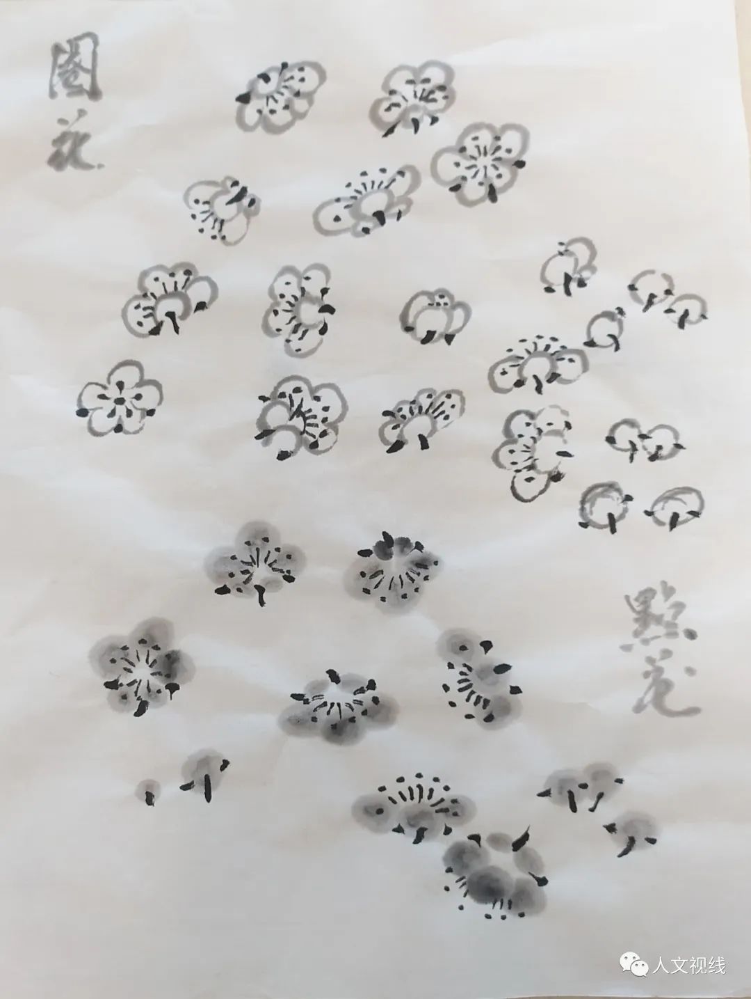 圈花:花瓣朝下,朝上,左侧,花苞欲放,用点代表花萼,花蕊。正面五瓣梅花。背面画花萼。花蕊墨色重。