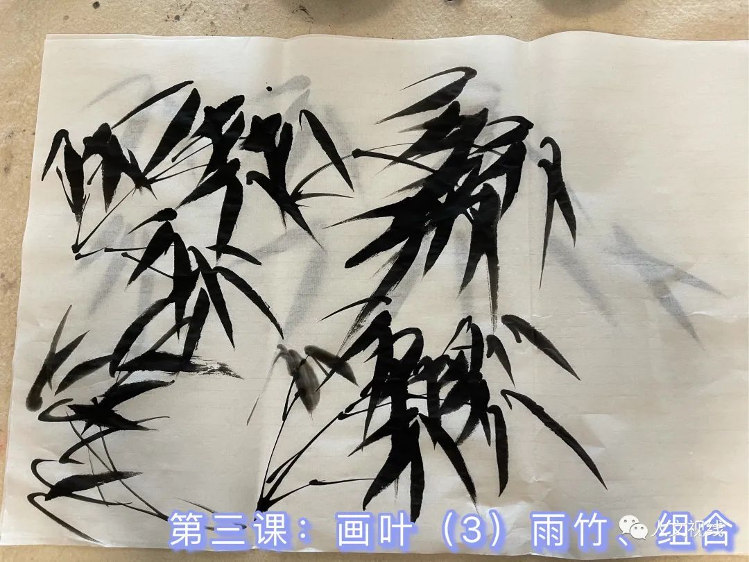 竹竿宁折不弯,竹叶画出疏密关系,大小,浓淡,错落有致。叶子要一个方向。