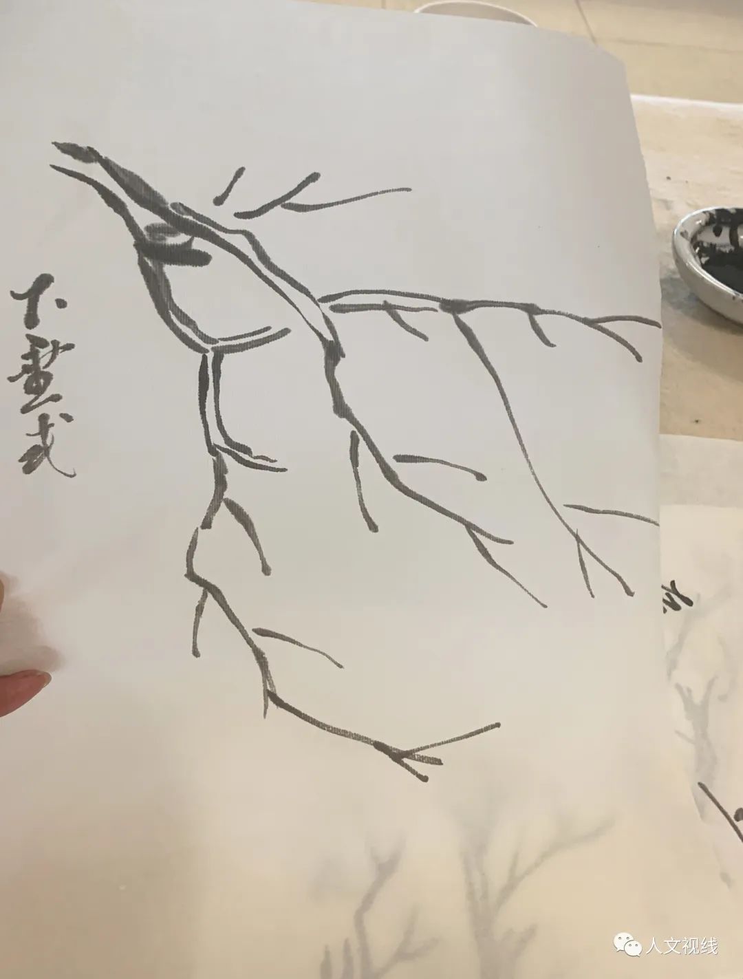 张老师让大家画线条,藏头护尾。黄宾虹说中国画的笔墨就是太极图,欲左先右,欲右先左,欲上先下,欲下先上,如打太极。原路收回,把毛笔的弹性充分运用出来,线条是有力量的。