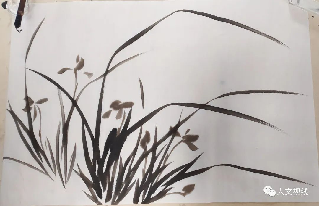 兰花是五笔,要淡一点,有层次。毛笔洗干净,头上蘸墨。