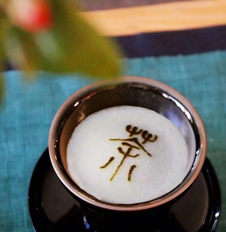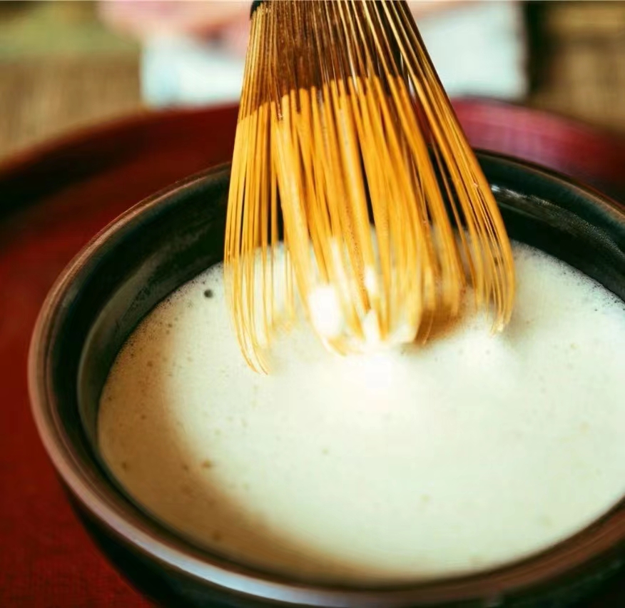 Tips:茶筅[chá xin],是点茶的一种烹茶工具,由一精细切割而成的竹块制作而成,用以调搅粉末茶,是点茶的必备工具。