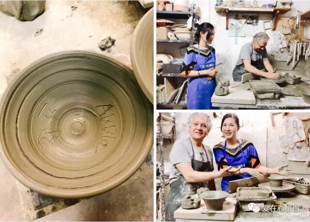 可爱的店主Agos Branca大叔还教我们用胚土简单的做陶碗,他一直说着意大利语,虽然听不懂,但是也能明白个大概的意思,过程好玩也很有成就感,最后还把自己的名字弄上去了,我想这只碗留下来烧制,可能是不太容易拿到,但这个体验过程已经非常有趣了。