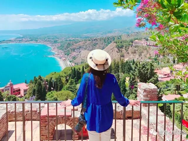 柱后面便是烟波浩淼的大海,山花浪漫、云淡风轻的隔海湾相望西西里岛上云雾中掩映的艾特纳火山ETNA,特别有意境。
