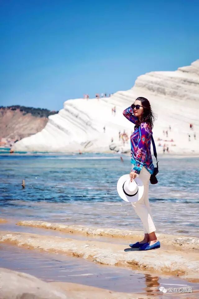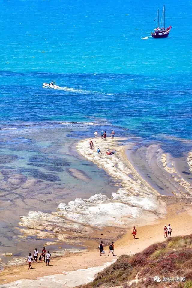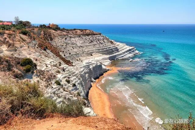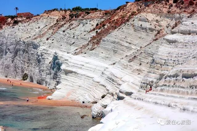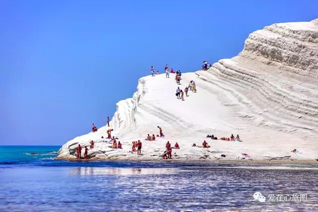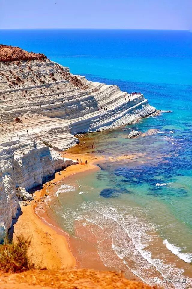 在西西里岛西南的阿格里真托海边,有一片叫“土耳其台阶”的白色石灰岩悬崖,由于常年接受热情的地中海海浪冲击和烈日炎炎的暴晒,在悬崖表面形成了一片片、一级级波浪形的白色纹路,远观确实好像一片白色的阶梯建在悬崖上,在碧海蓝天下更能衬托出白色的纯洁之美,让人不得不佩服大自然的鬼斧神工。