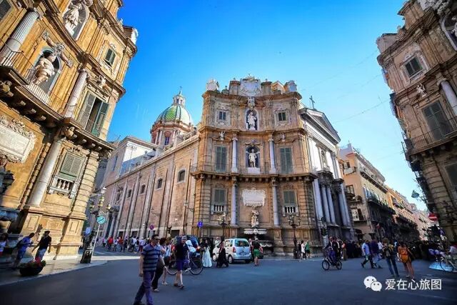 巴勒莫最重要的历史建筑是从一个叫四角广场Quattro Canti的中心发散开来,广场不大,但四个角的建筑很有特色,每一角都有小型喷泉,每一层楼都有雕塑正对广场的中心。