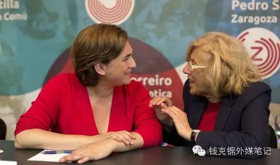 巴塞罗那市长科洛(左)和马德里市长卡尔梅娜。两人都是坚定的自由派。科洛本人生长于巴塞罗那,曾因家庭经济困难而中断大学学业。(图片来源:http://elpais.com)