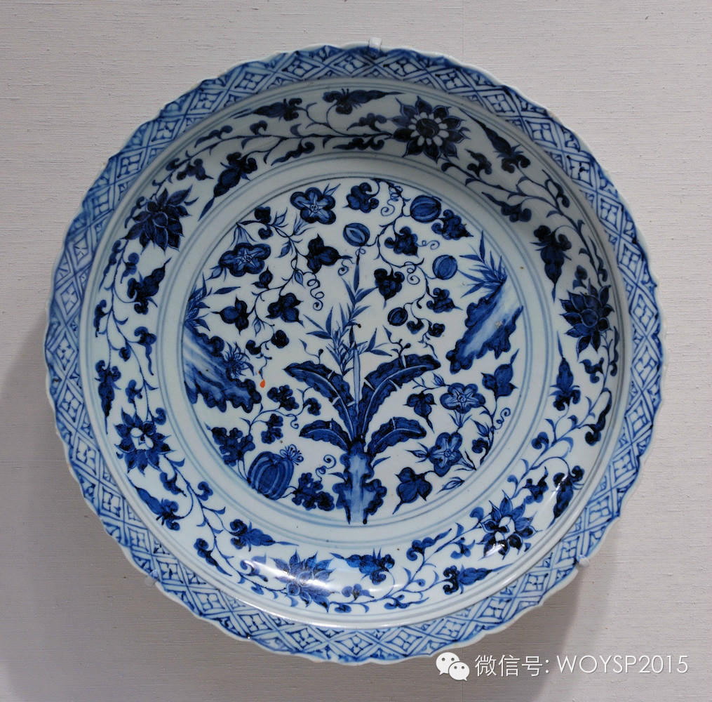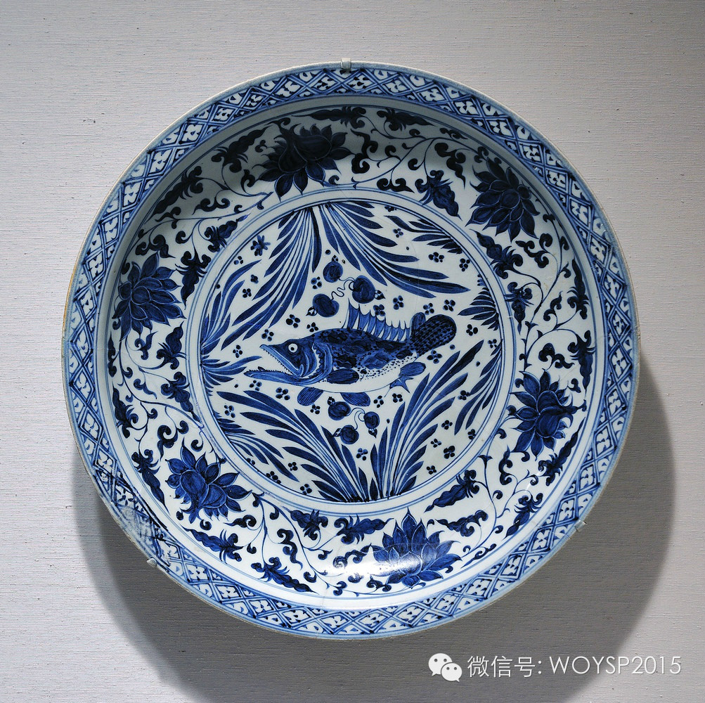 盘是元青花瓷的典型品种之一,从尺寸上看,有大中小之分,从口沿上分有折沿、敛口、菱口之分。大盘多为折沿盘,口沿分菱花和圆口两类。大盘形体较大,一般口径都在40厘米以上,最大的近60厘米(印度老德里皇家宗教遗址出土),以口径45厘米左右的盘比较多见。