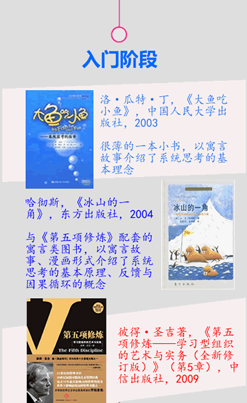 在入门阶段,主要目的是了解系统思考的概念、基本原理,引起学习者深入探究的兴趣,为此读物要写得通俗易懂,简单、有趣。综合上述考虑,我为大家推荐三本基本上是实践导向的或寓言故事类、通俗易懂的读物: