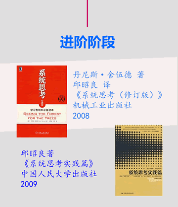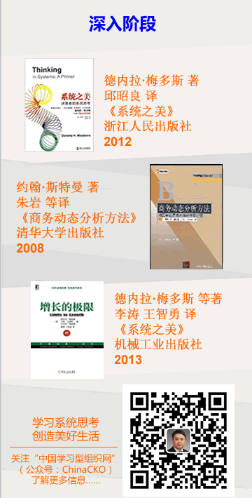 因此,我认为,在深入阶段,至少可以分三条途径进行深入探索:从原理上,可以去阅读一些较为学术性或有一定深度的经典读物,包括相关哲学、思维科学;从应用方法上,可以去了解更多关于系统动力学建模、系统基模等方面的专业读物;从应用领域上,可以去了解系统动力学(系统思考)在教育、环保、经济、管理等各个领域的应用专著。