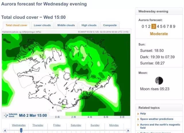 白色代表天空晴朗,右上角标注的极光的强度。如果你所占的地区是晴天,而今天有是一个高强度的极光预测,那就恭喜你,很有可能看到极光了。一般极光出现的时间是在9点到凌晨2点左右。