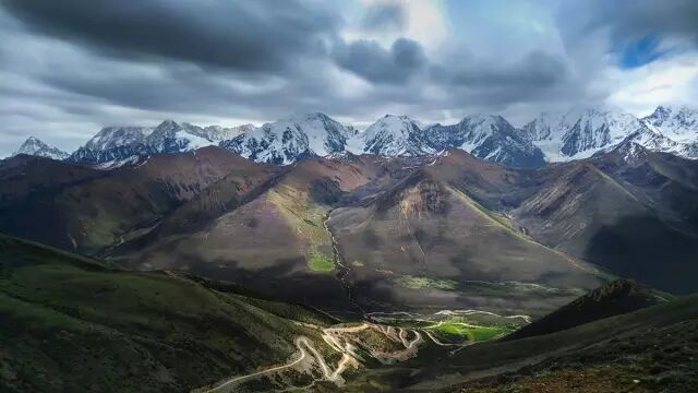 这里也是贡嘎观景平台,我们拍到了乌云下的贡嘎群山,气势非凡;更是拍到了“裸奔”下的贡嘎。壮美的贡嘎雪山,尽收眼底。第二张图片中,最右边的就是贡嘎主峰。