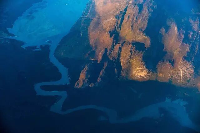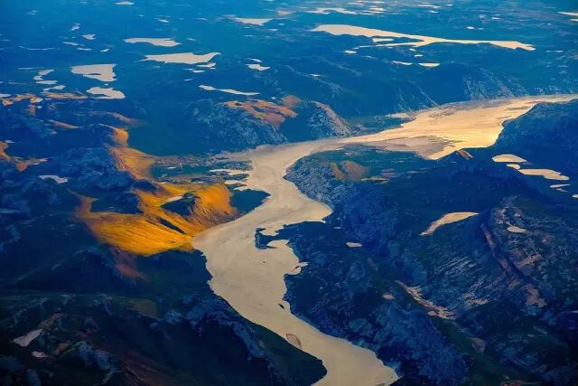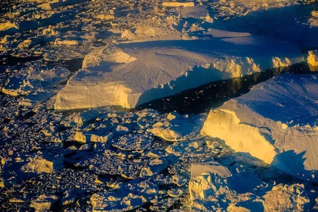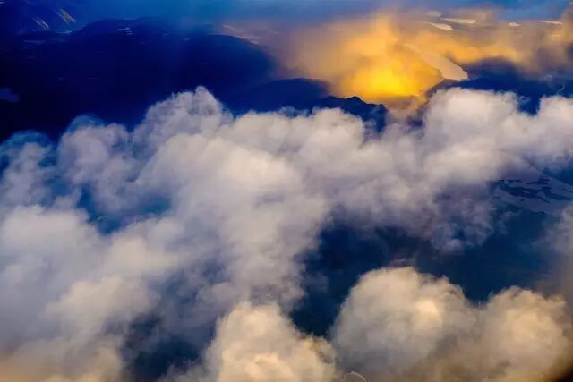 飞机上,迎着午夜极昼的光线,从飞机的窗口,先领略一下格陵兰的壮美。云海,河流、高山、还有巨大的冰块。这是真正的航拍了。