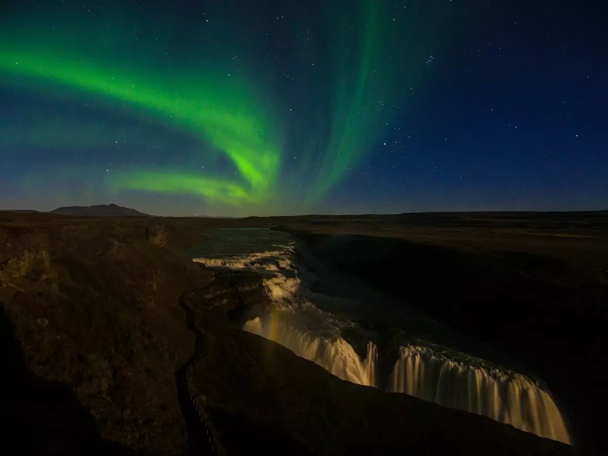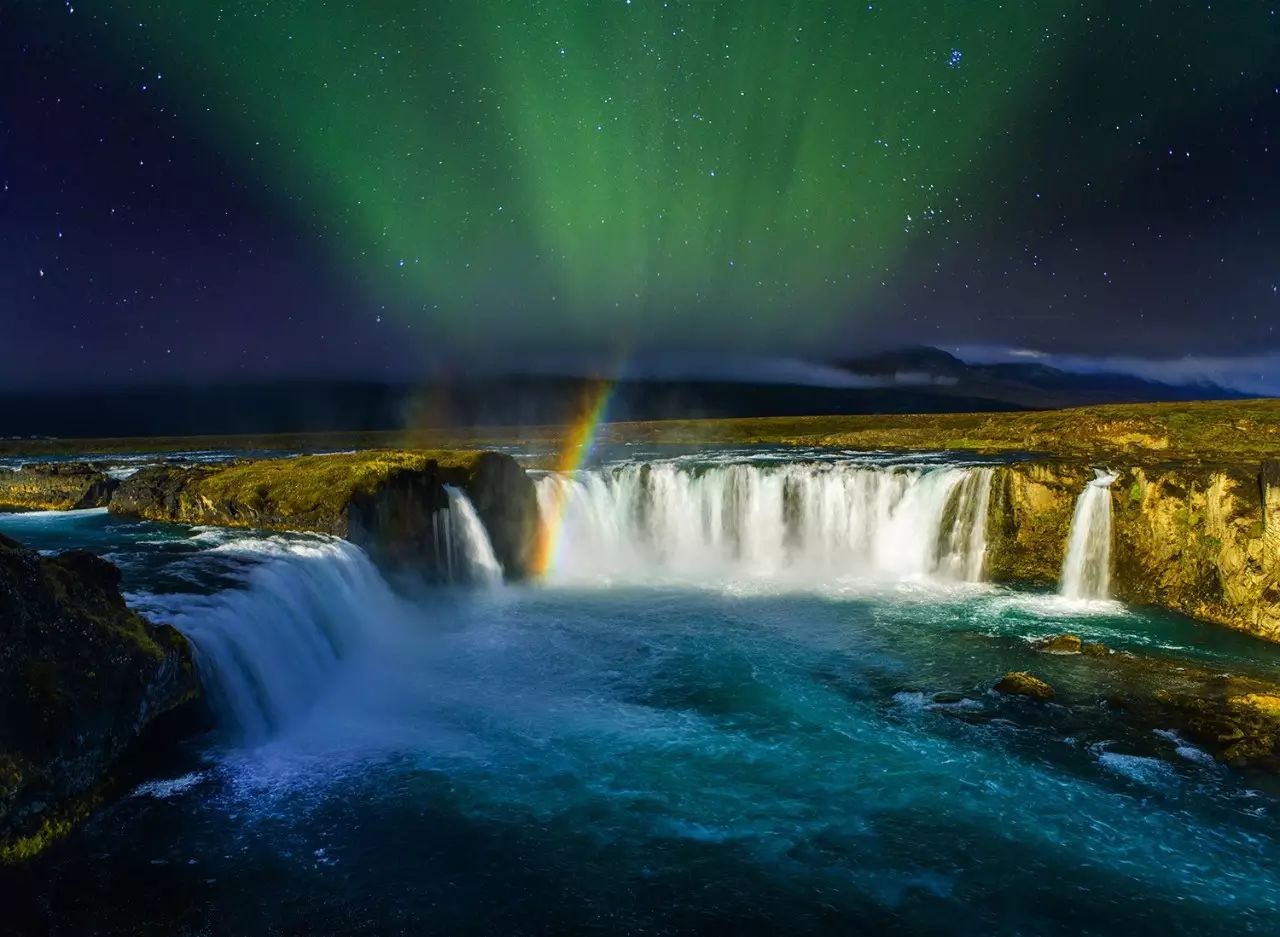 我们来看看下面这张奇特的作品吧。月光从背后照过来,在瀑布的水汽上形成了彩虹,于是就出现了极光和彩虹共存的奇妙景象!