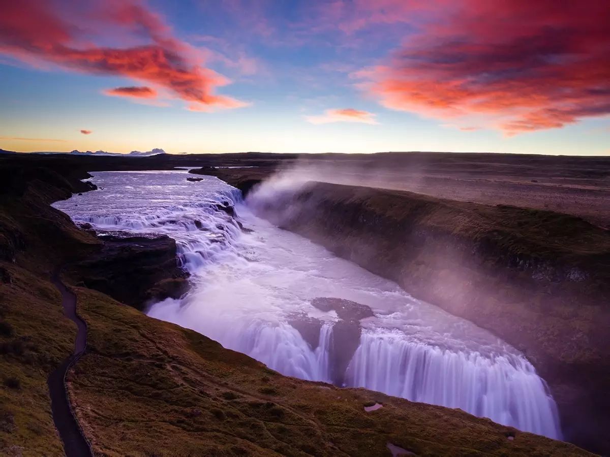 本次冰岛摄影之旅,接近尾声。我们一共遇到了4次极光。昨天晚上的最为绚丽,今天选择了一个好的拍摄场景,冰岛最震撼的黄金瀑布-Gullfoss!这是早晨的景象。