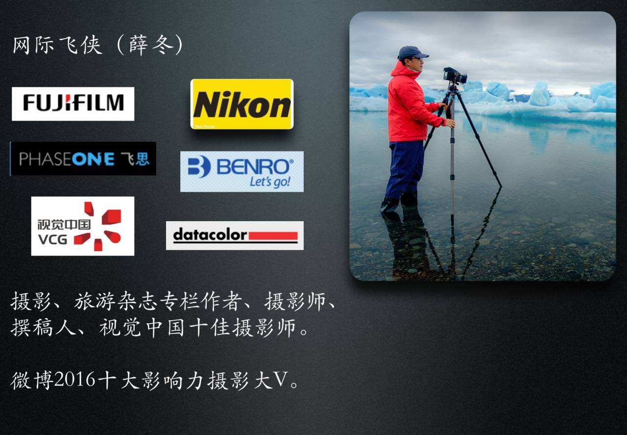 知名风光摄影师,摄影培训师导师。丹麦飞思、日本富士、百诺签约摄影师,德塔色彩管理专家,尼康合作摄影师、微博2016十大影响力摄影大V。世界顶级图片库-视觉中国(Gettyimages China)十佳摄影师,特殊贡献奖得主。