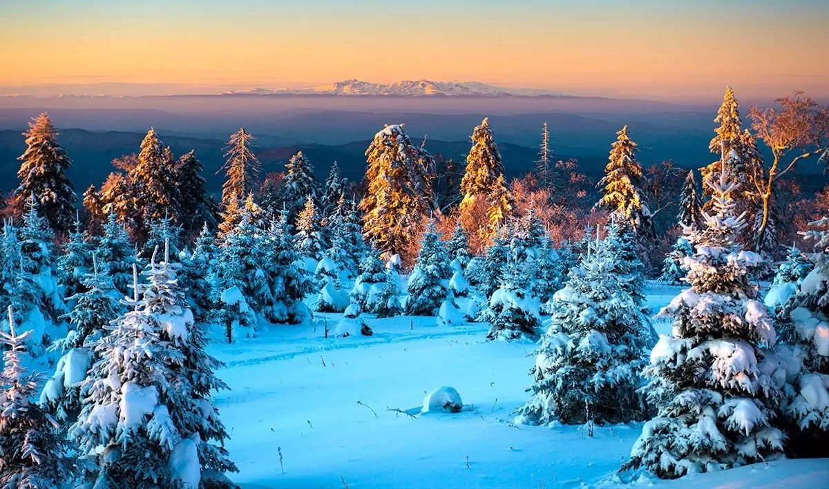 魔界江畔的日出 雪岭(老爷岭),海拔1457米,徒步穿越雪岭,仿佛穿越童话世界。这里的林海雪原景观堪称一绝,可远眺东北圣山——长白山。