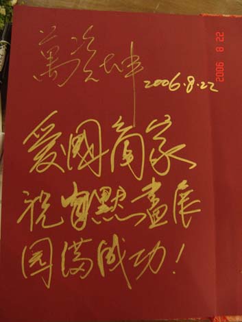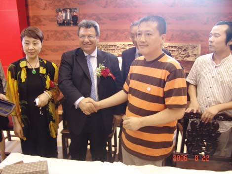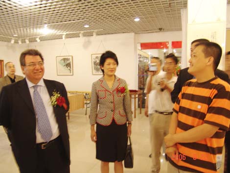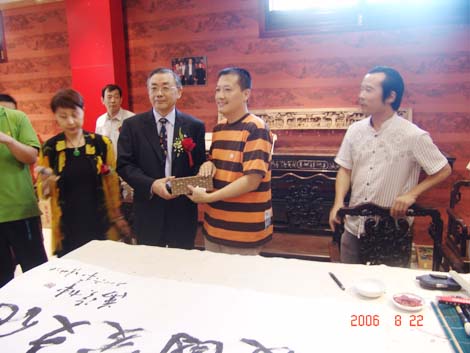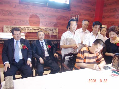 8月22日下午,国际珠宝联盟主席卡瓦列里、全国工商联金银珠宝商会会长万资坤在大钟寺国际美术馆参观崔自默博士书画作品展,在贵宾室,崔自默博士为国际珠宝联盟主席卡瓦列里、全国工商联金银珠宝商会会长万资坤刻印章,在场的还有六位副会长、燕砚斋文化传播公司总经理黄学礼、爱家收藏董事长王蓓等。在众人的环视下,崔自默博士一挥而就,平均每方印用时约两分钟,深得在场人士夸赞。