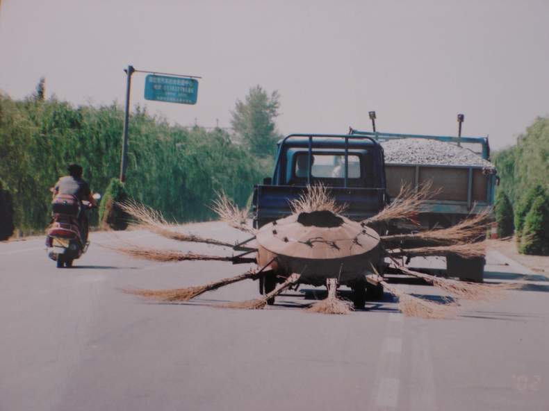 忽然见到前面有一个样子很奇怪的东西。仔细看,才知道那是扫马路的垃圾车。用拖拉机拖动着一个大轮子,上面插着几把扫帚,前进时,轮子转起来,扫帚就扫过地面。其实,扫帚基本没有扫到什么东西,只是把尘土起土来,挥洒到路边罢了。