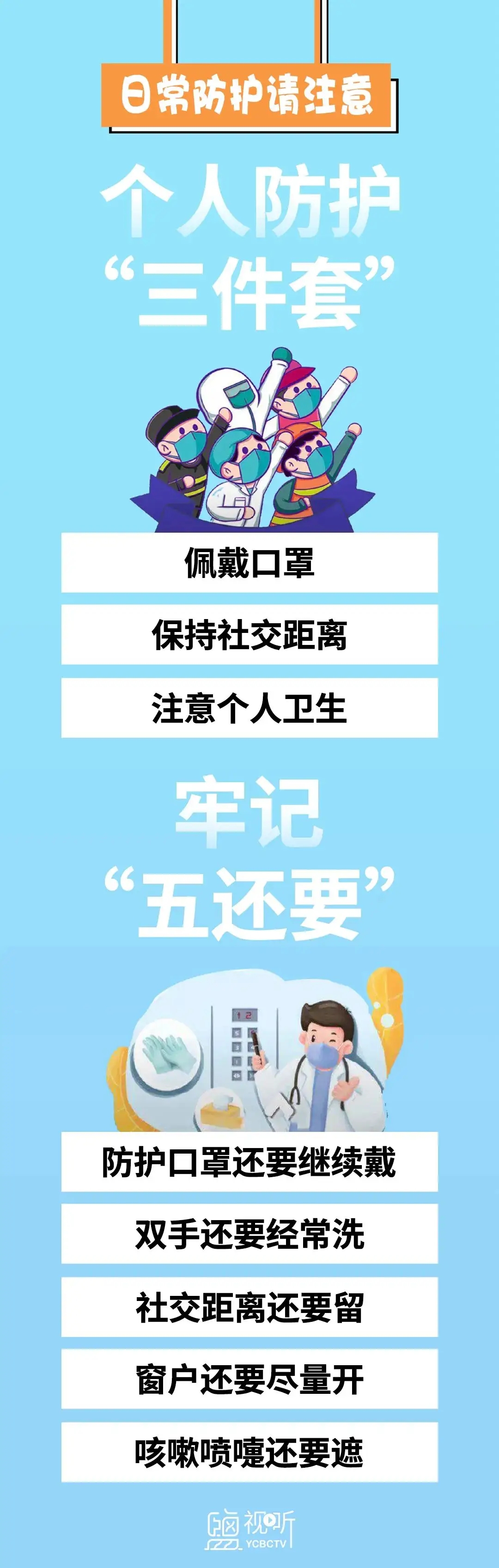 三、 预防疫情的三件套:戴口罩、保持社交距离、注意个人卫生。“五还要”:口罩还要戴,社交距离还要留,咳嗽喷嚏还要遮,而且双手还得经常洗,门窗还得尽量开。时刻要保留在心中,时刻注意着