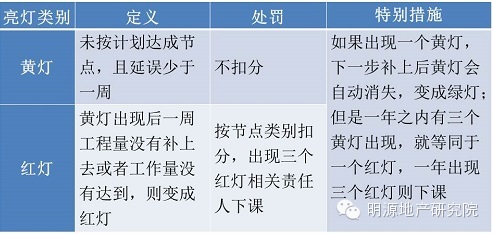 在明确了责任人后,万达针对每个节点赋予不同的考核分值,其中一级节点15分,二级节点10分,三级节点5分,针对这些节点万达出台了红黄两大亮灯机制:
