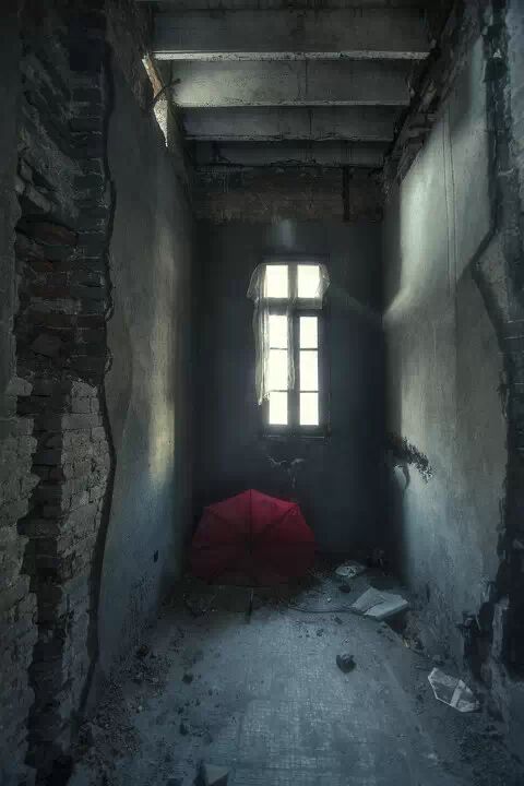 透过东楼一闪破旧的窗口口望向地下室。里面挂满了白色的绳子看起来异常恐怖