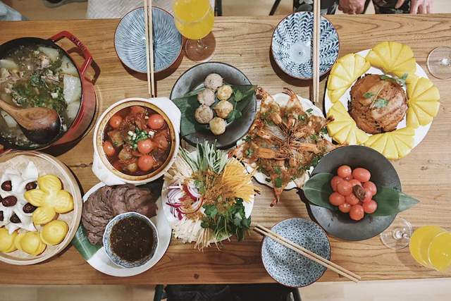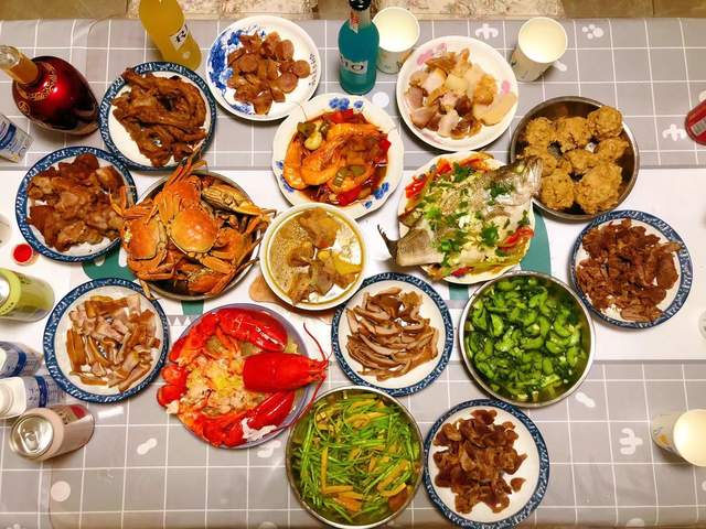 吃年夜饭,是大年夜阖家团聚,人们享受满桌的佳肴盛馔,享受那份快乐的气氛。桌上有大菜、冷盆、热炒、点心,一般少不了鱼,"鱼"和“余”谐音,是象征“吉庆有余”,也喻示“年年有余”。还有萝卜俗称菜头,祝愿有好彩头;龙虾、爆鱼等煎炸食物,预祝家运兴旺如“烈火烹油”。最后多为一道甜食,祝福往后的日子甜甜蜜蜜,这天,即使不会喝酒的,也多少喝一点。
