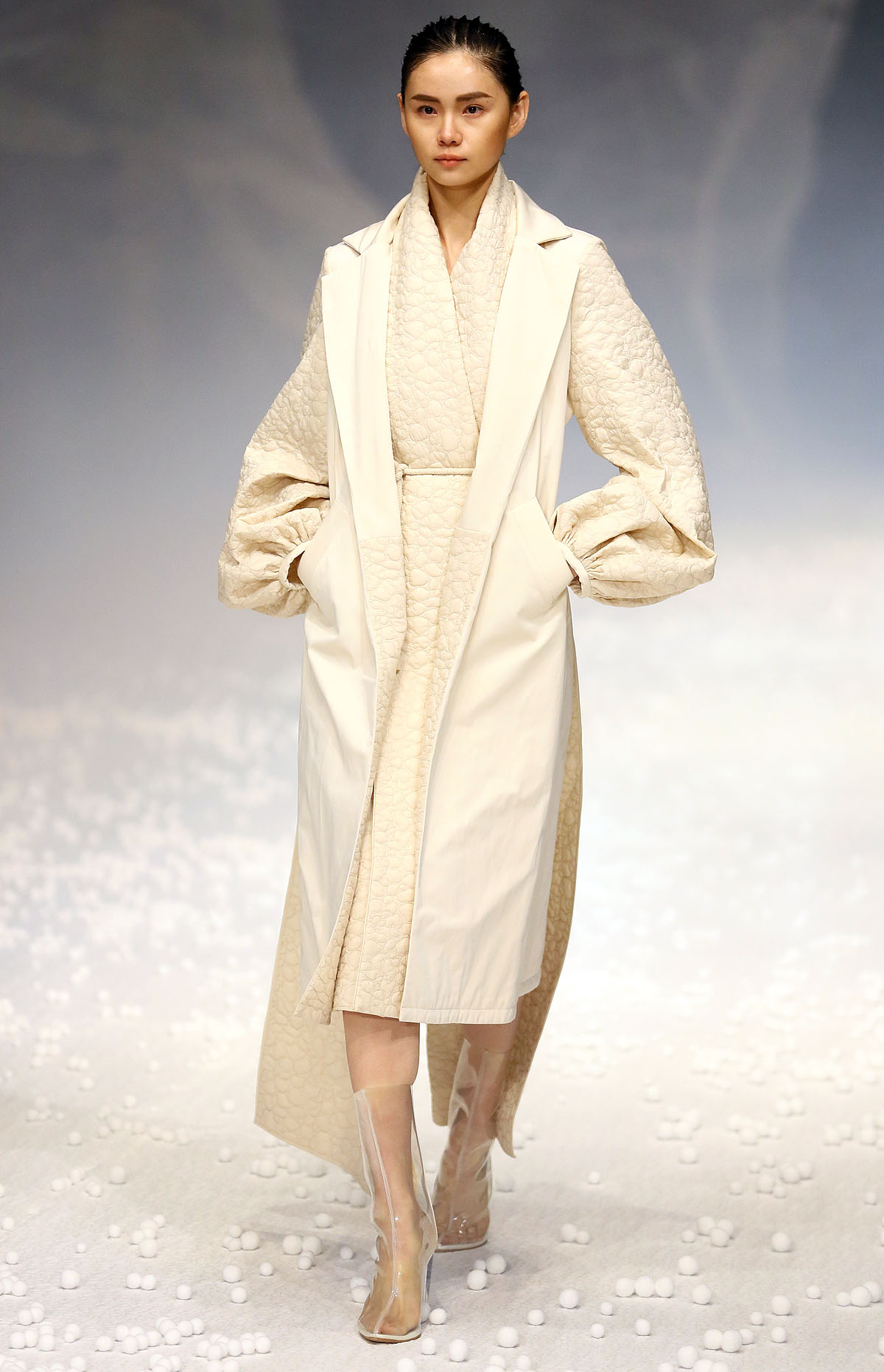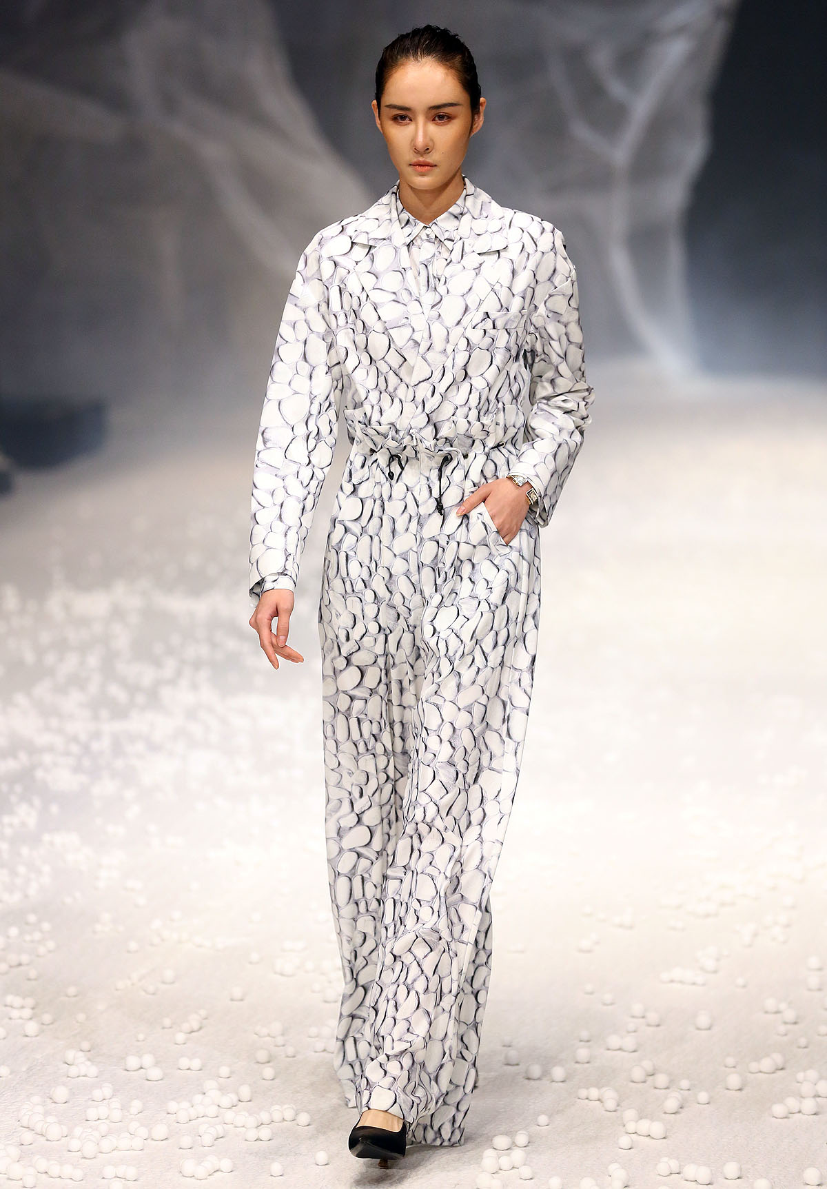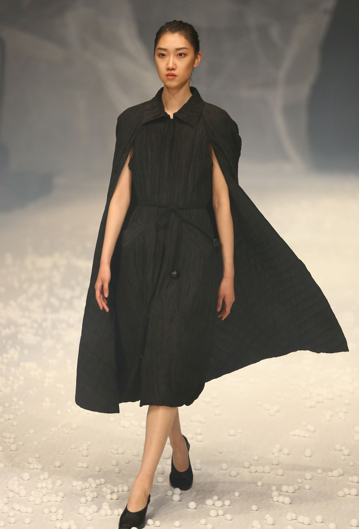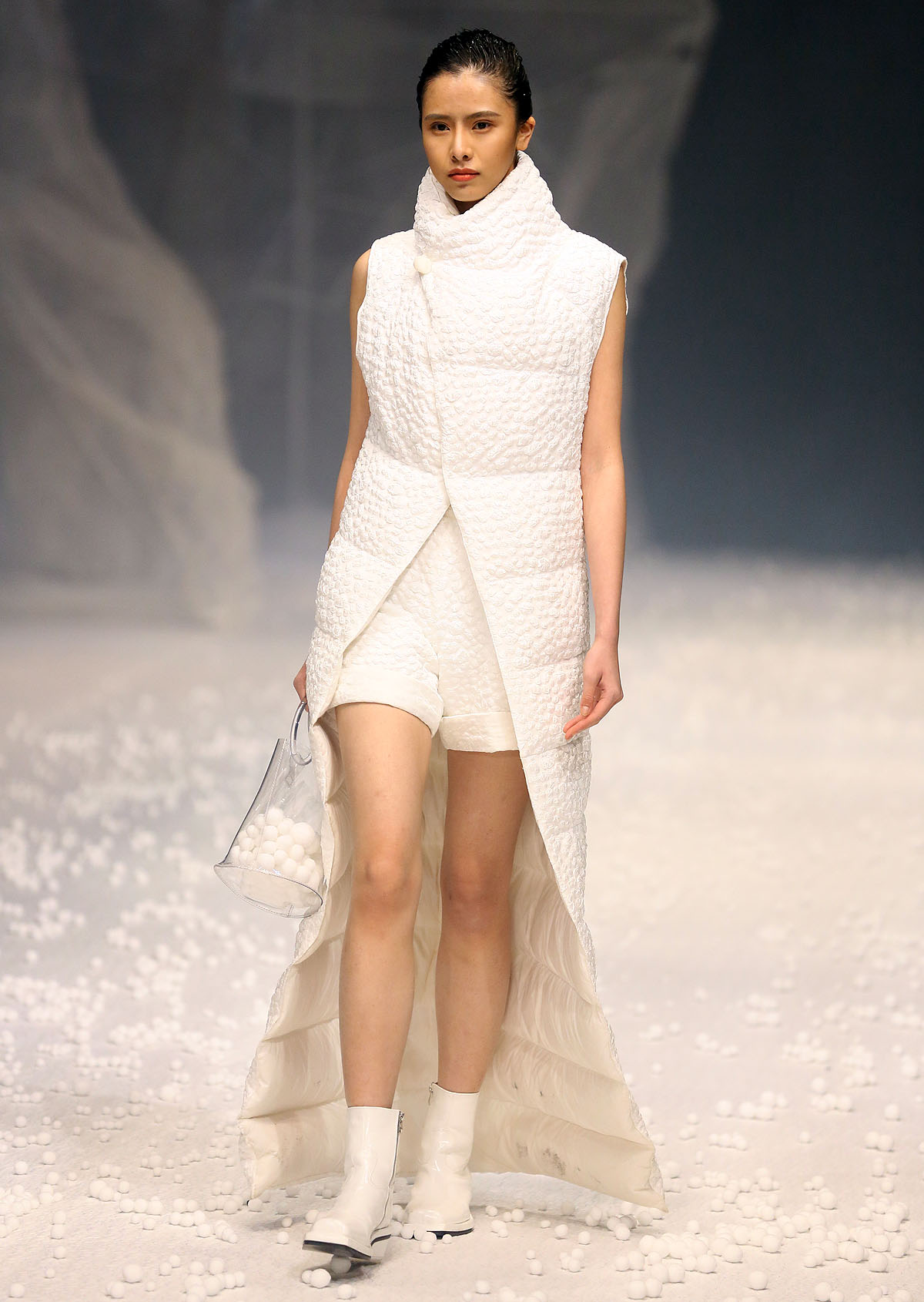 除了用材及设计“羽”众不同,在视觉体验上,设计师以白色为基础色,以大地色、浅驼色为点缀,以黑色为辅助,干净纯粹,简单分明。据设计师介绍,此次发布会主题,灵感来源于自然界中看似统一但形态各异的石头,强调对度的把握,追崇时时处处、恰到好处的意境。【采写:戚连民 摄影:戚连民】