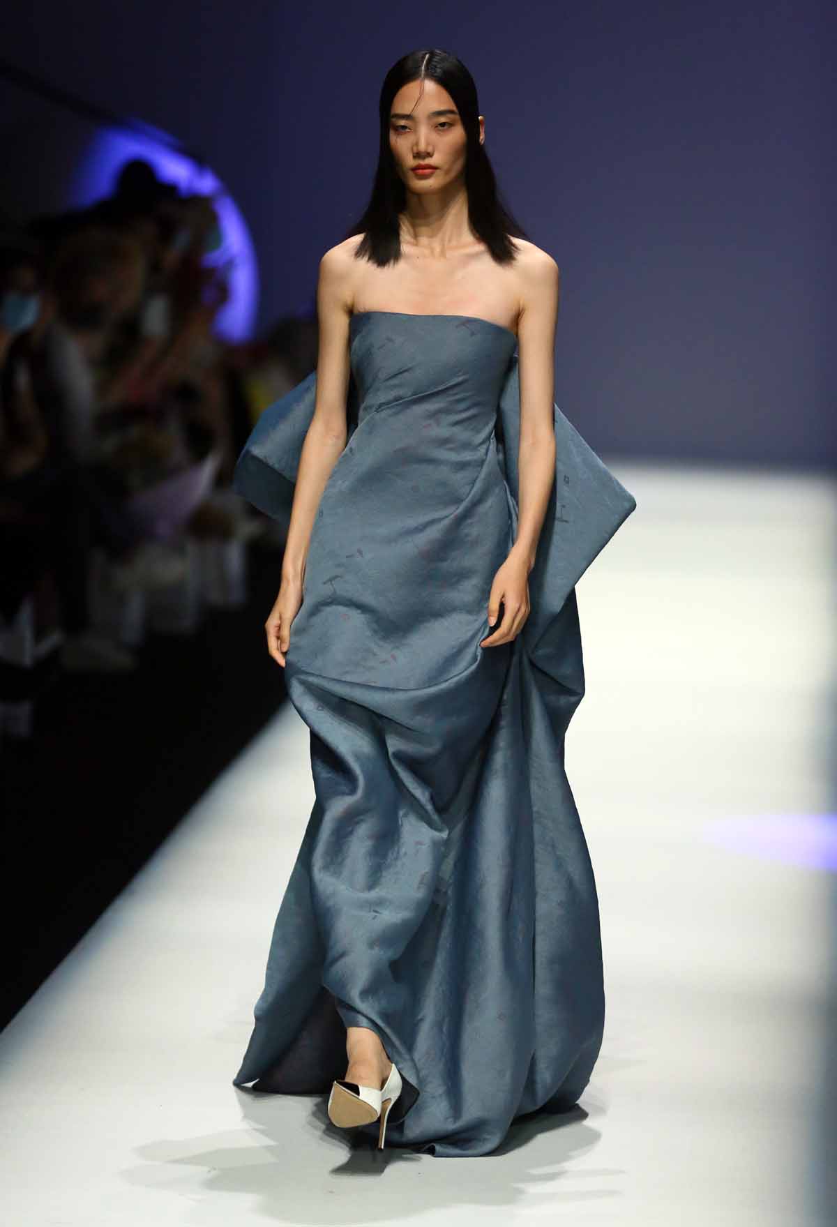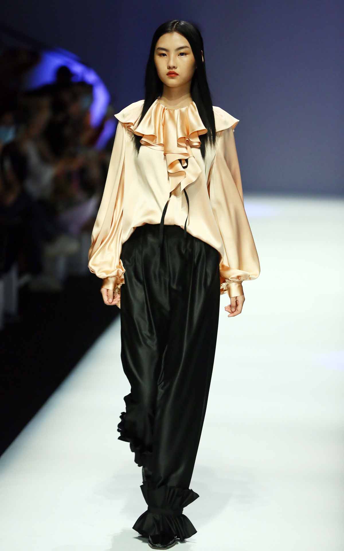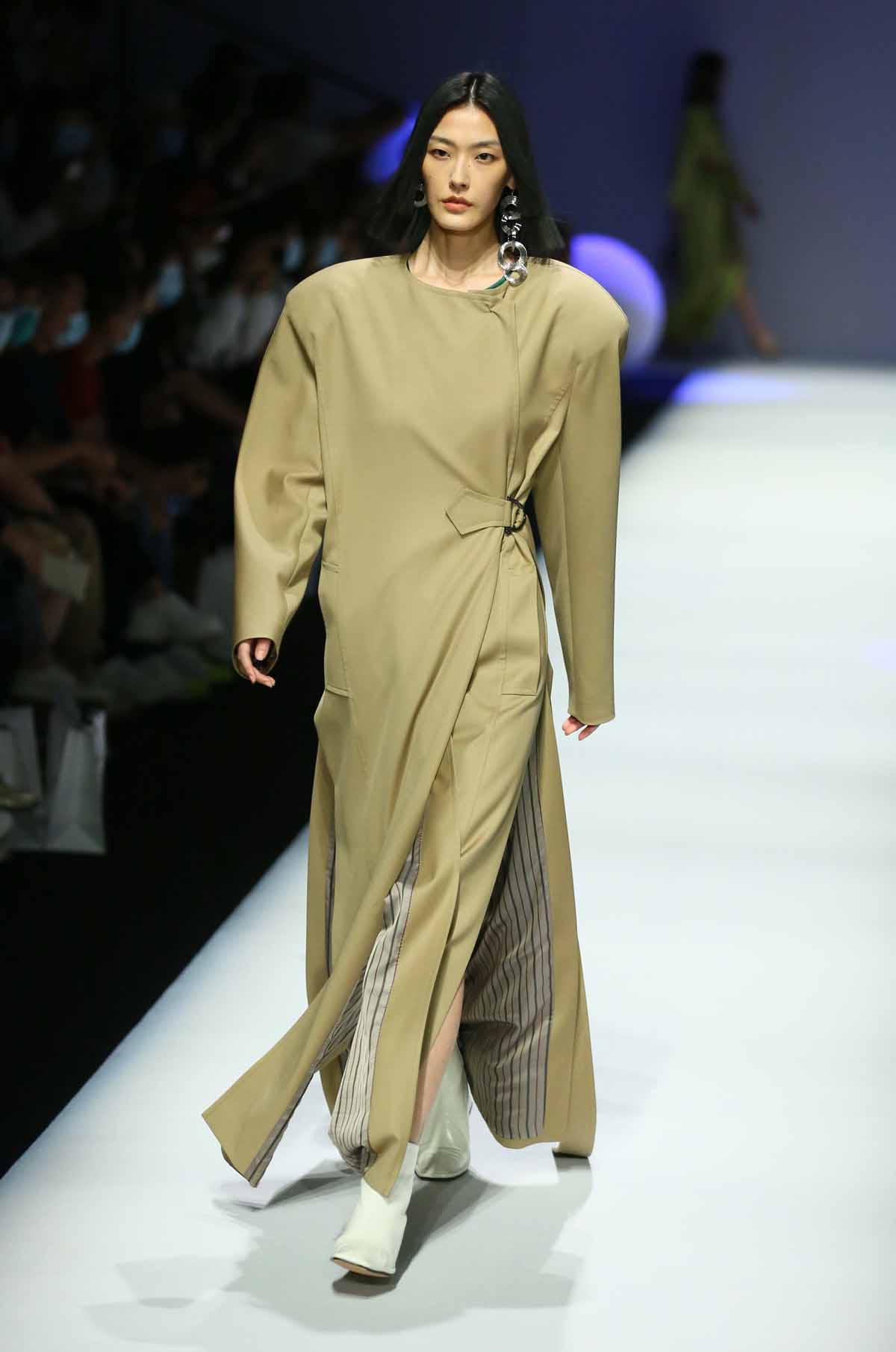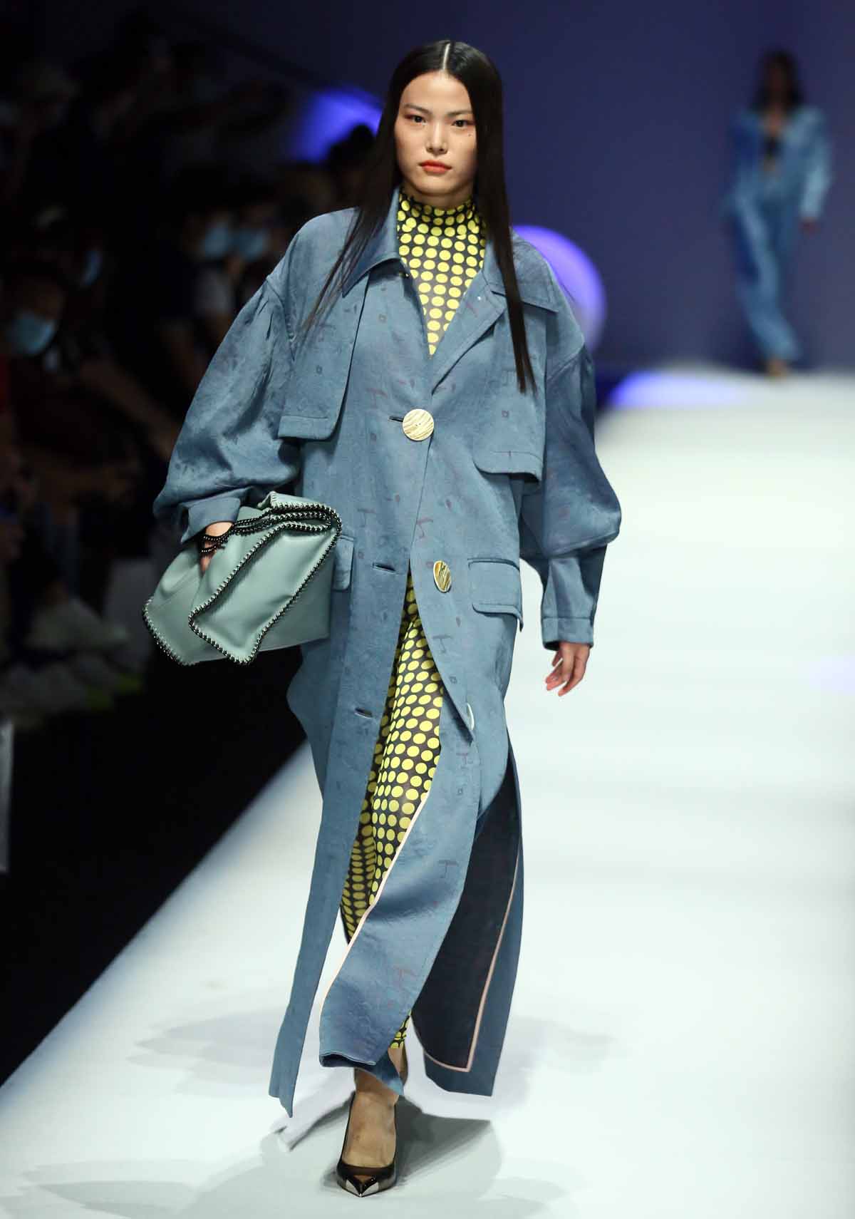 以往的邓兆萍,更像一个文化的推广大使,肩负将文化发扬光大的重任,同时又身兼“科技、创新、时尚三位一体”践行者的荣光,我们很难透过这些“坚硬”的命题去窥见真实的邓兆萍,正是这种“天然的屏障”让观众和设计师之间少了一些“亲昵”地互动。2021年疫情反复、暴雨突袭都让创作思潮开始真正抚慰大众的心灵,邓兆萍也不例外,用力打破常规,与消费者无间互动,是本季最大的前进。【采写:戚连民 摄影:戚连民】