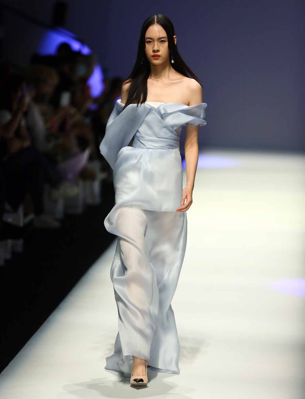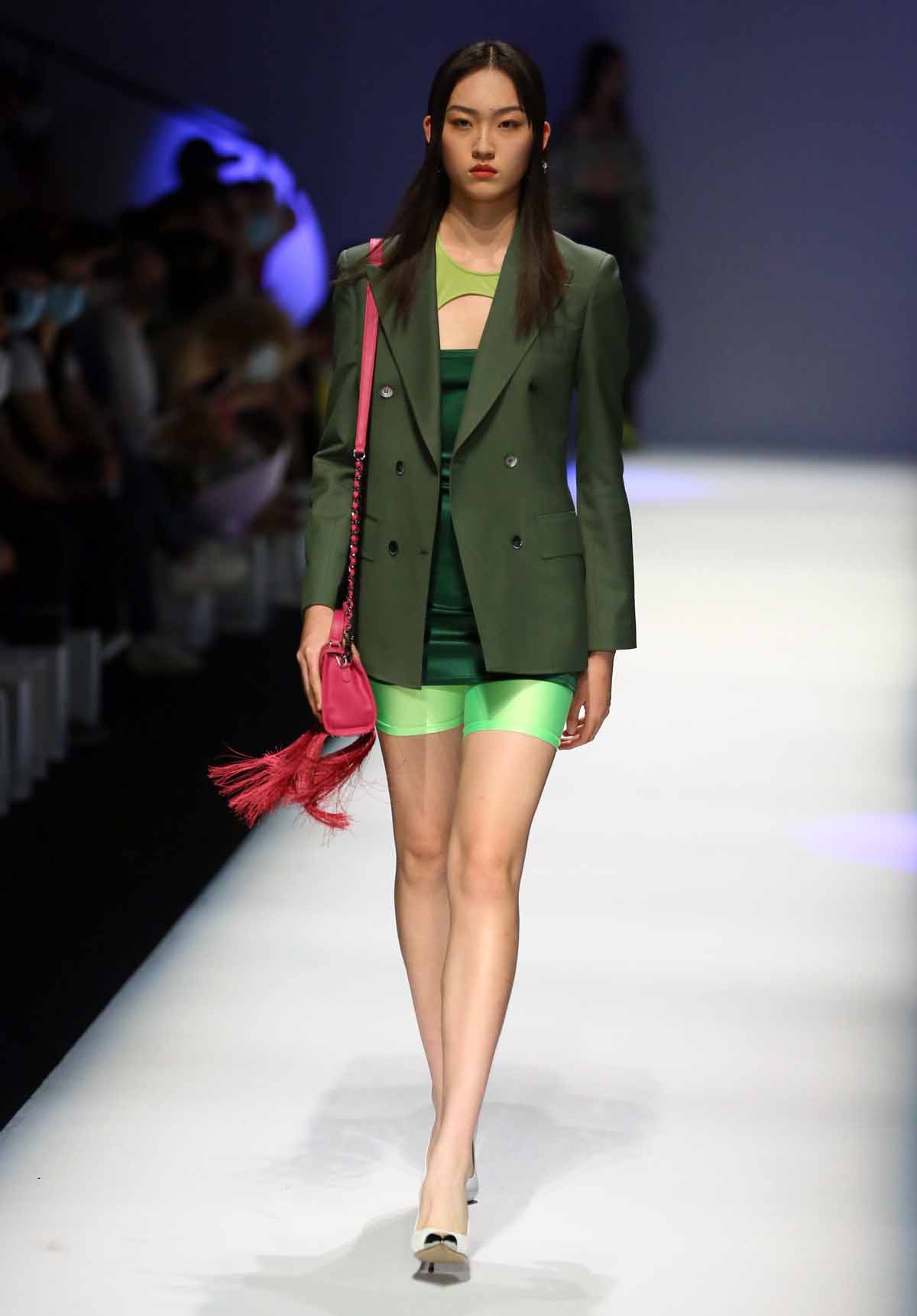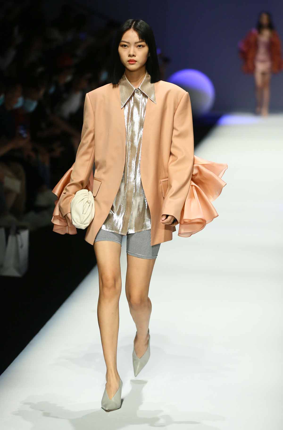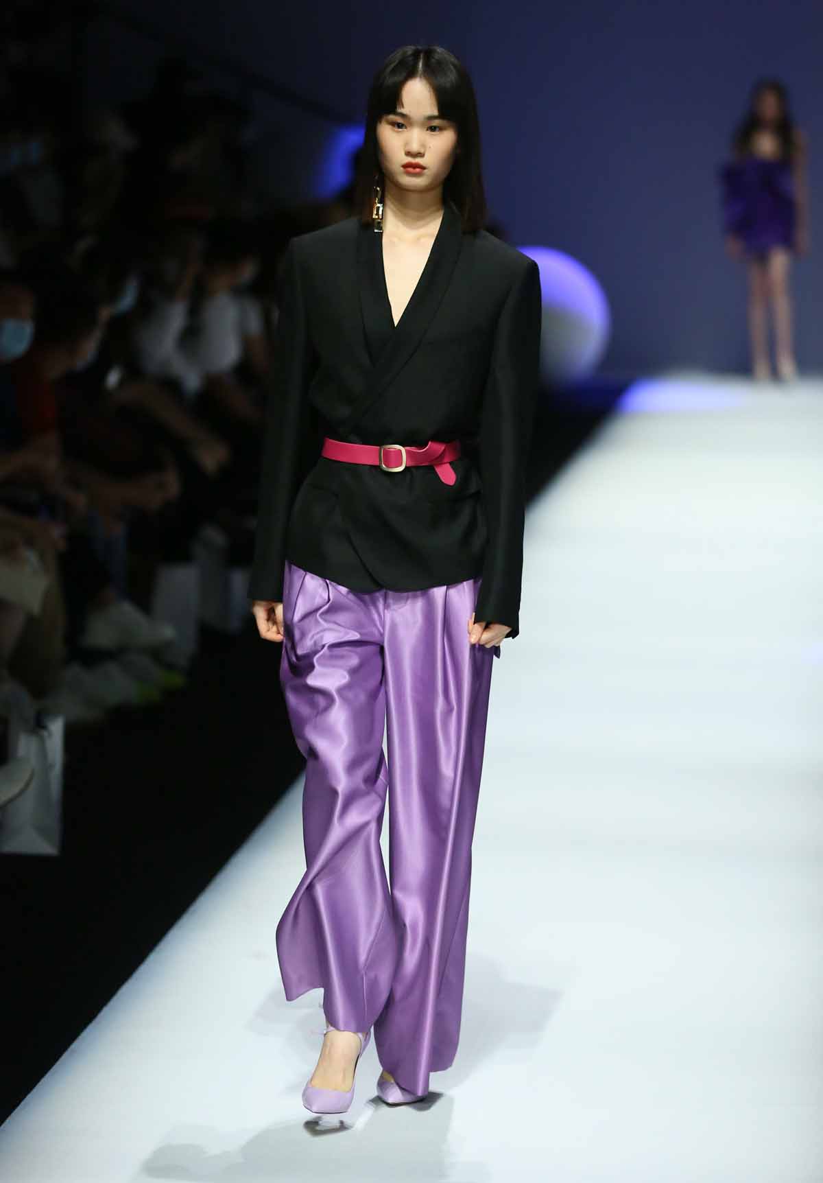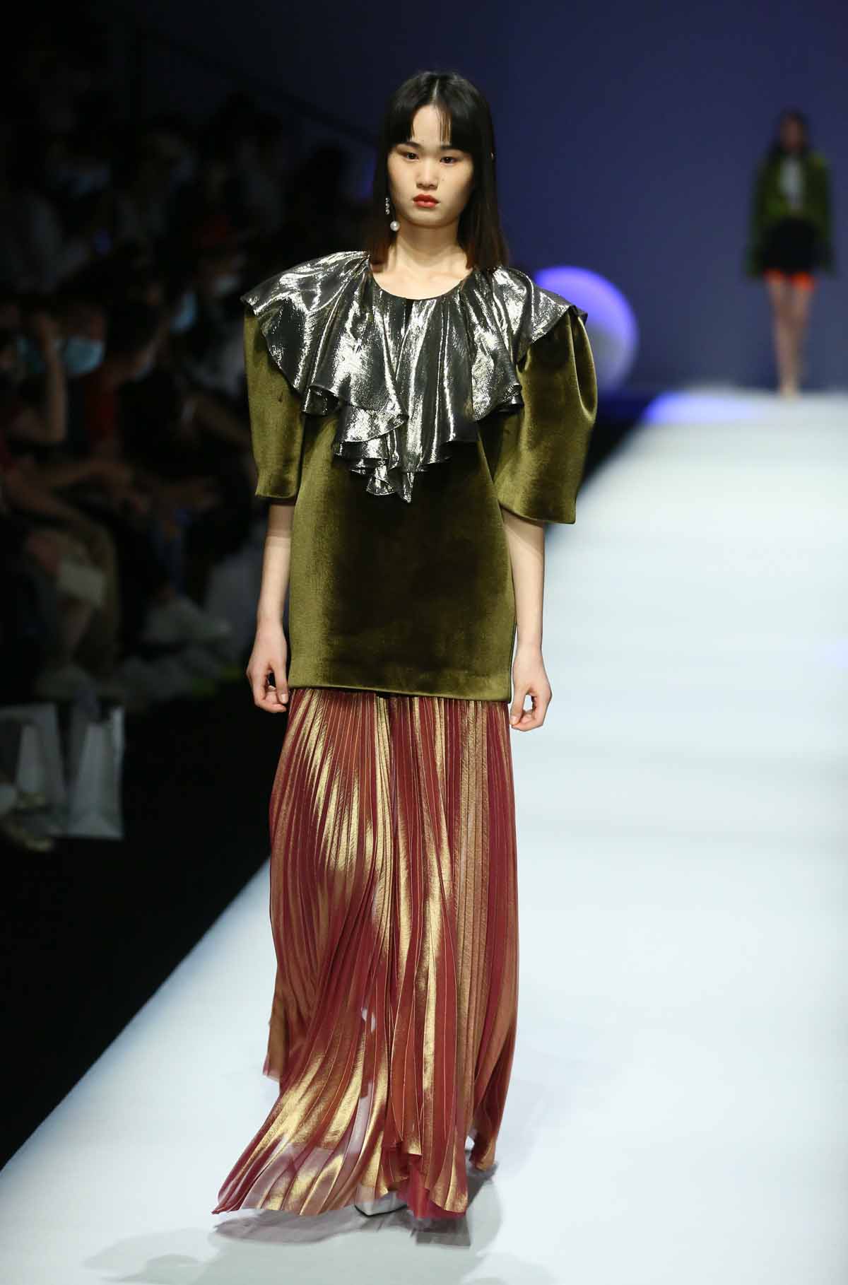以往的邓兆萍,更像一个文化的推广大使,肩负将文化发扬光大的重任,同时又身兼“科技、创新、时尚三位一体”践行者的荣光,我们很难透过这些“坚硬”的命题去窥见真实的邓兆萍,正是这种“天然的屏障”让观众和设计师之间少了一些“亲昵”地互动。2021年疫情反复、暴雨突袭都让创作思潮开始真正抚慰大众的心灵,邓兆萍也不例外,用力打破常规,与消费者无间互动,是本季最大的前进。【采写:戚连民 摄影:戚连民】
