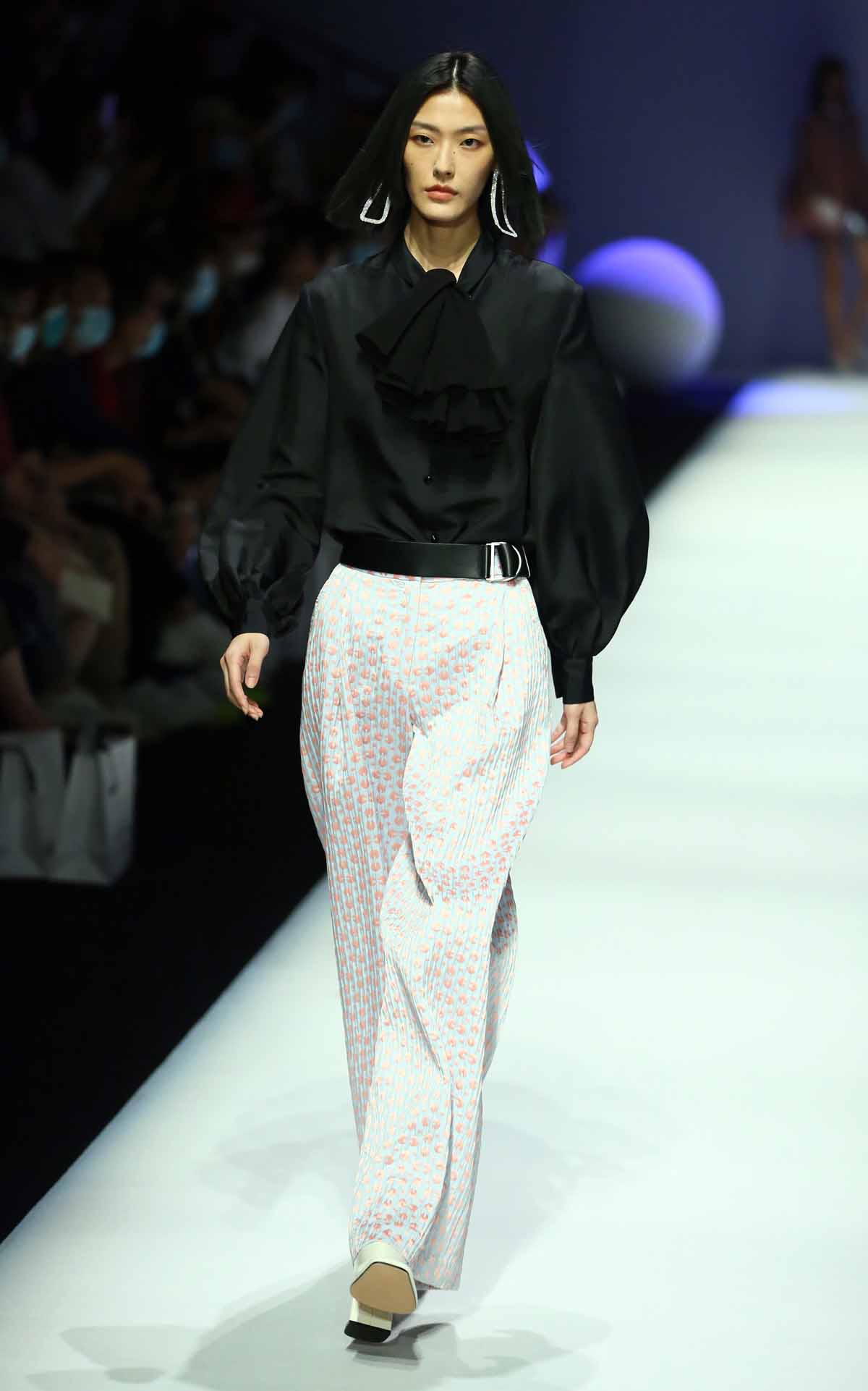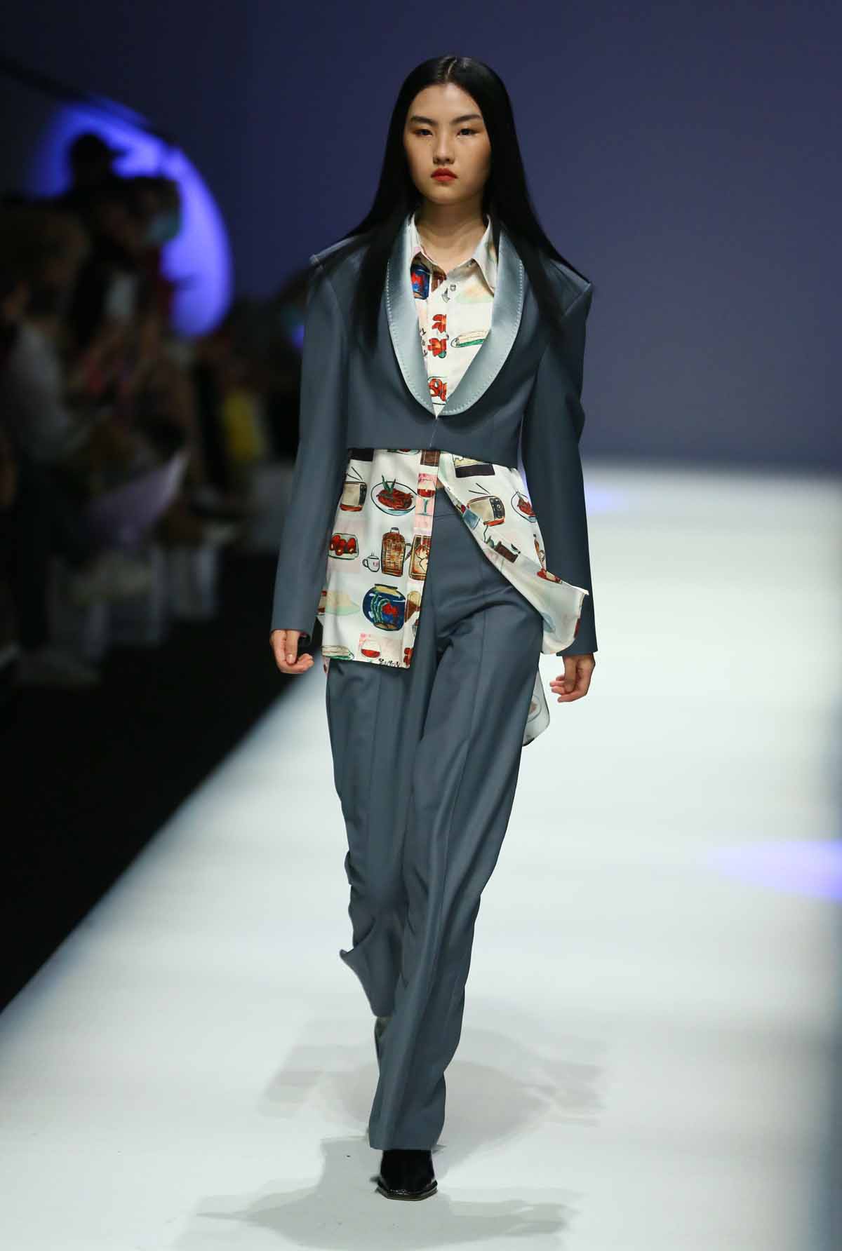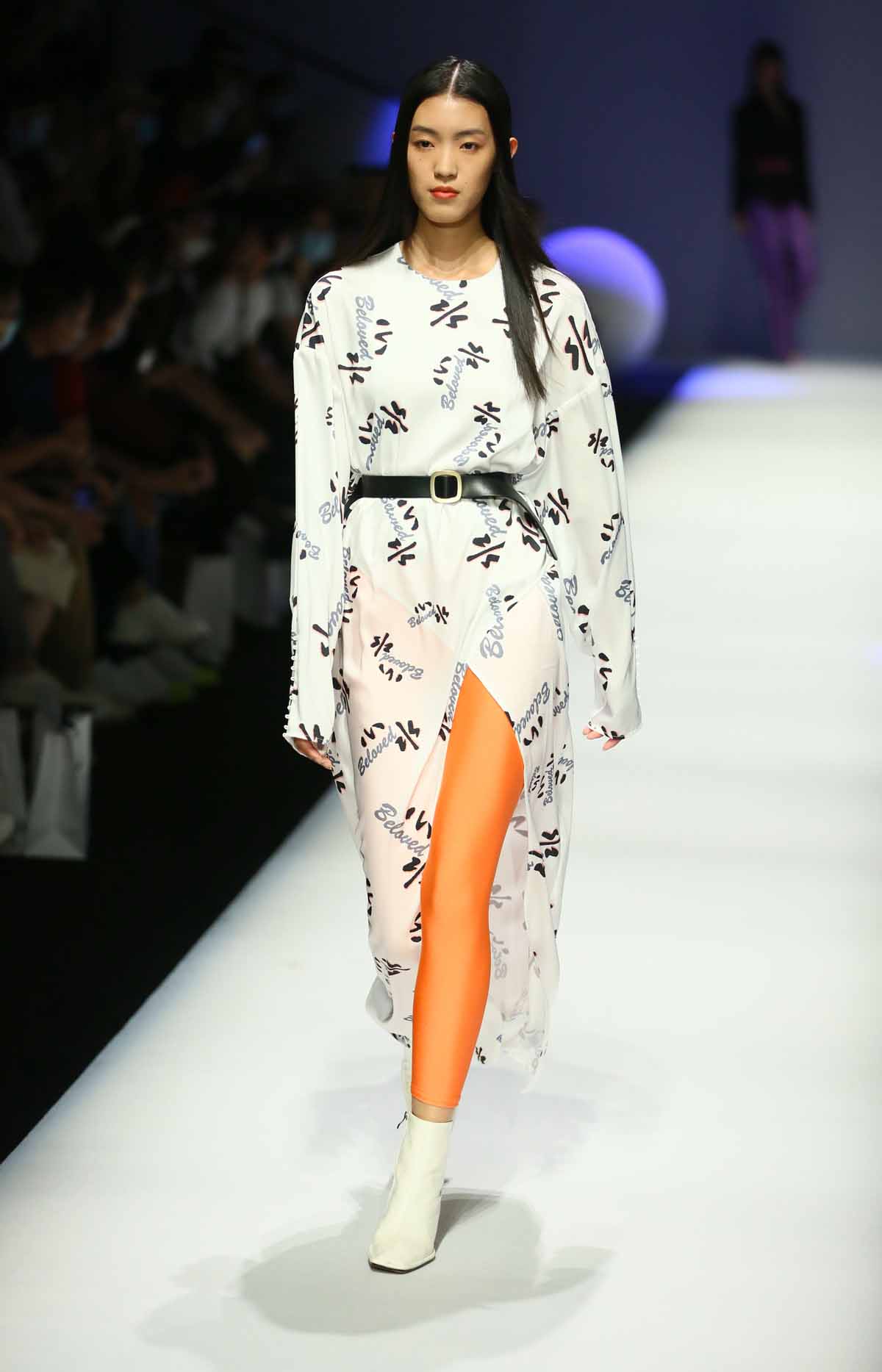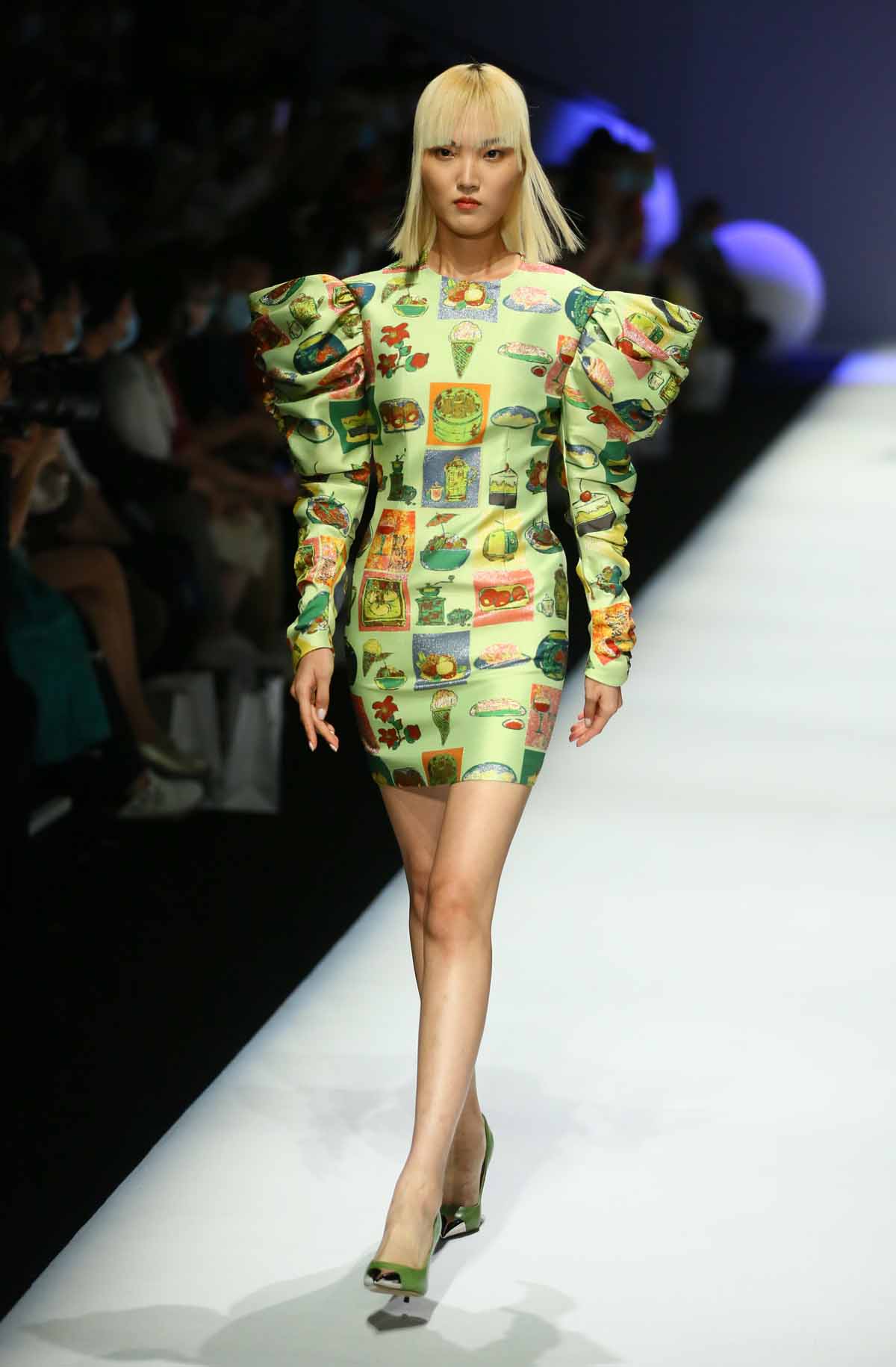 大秀采用“沉浸式走秀”的方式,在现代艺术装置中随性而来,形成与观众对话的共享空间,所有的布置都像是在等待观众的反馈,即刻又融为一体。复古的音乐、低沉性感的唱腔刚好与有趣的服装和谐对话,本季融合70年代复古不羁的风格与新色彩,交织自由与禁锢,摩登与传统,知性与恣意。色彩取于大自然,并以宽松廓形丰富女性线条,化用经典造型,凸显女性的优雅。很难想象邓兆萍“敞开心扉”后的“心水清单”会如此张扬,而且恰到好处地将这种张扬降温于有趣的印花图案中。邓兆萍用手绘抽象画风把“虾饺、烧卖、肠粉”等广府美食和粤语俚语“心水”运用到了设计中,既满足了年轻人“个性决绝”的心理需求,又在细节处用“好玩儿”的随意展现了她心头所好的生活。