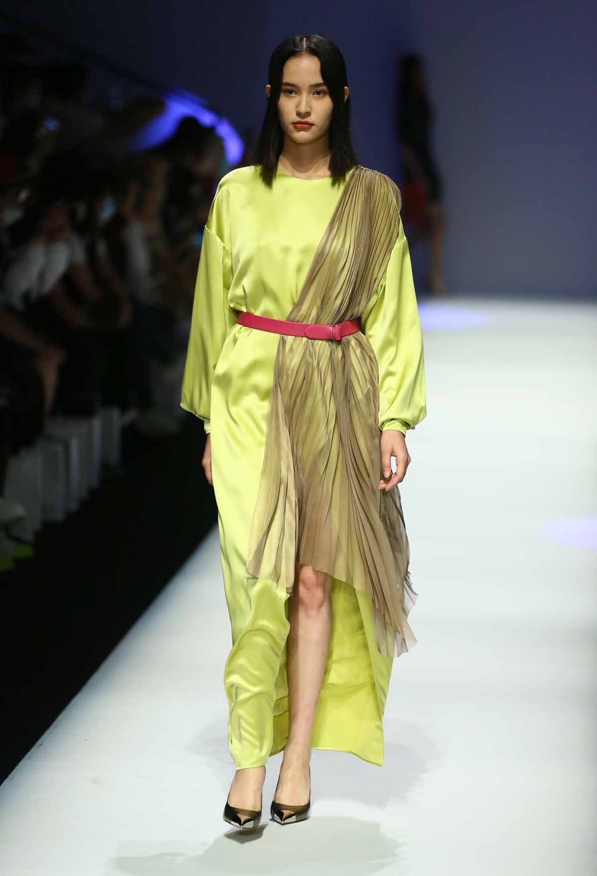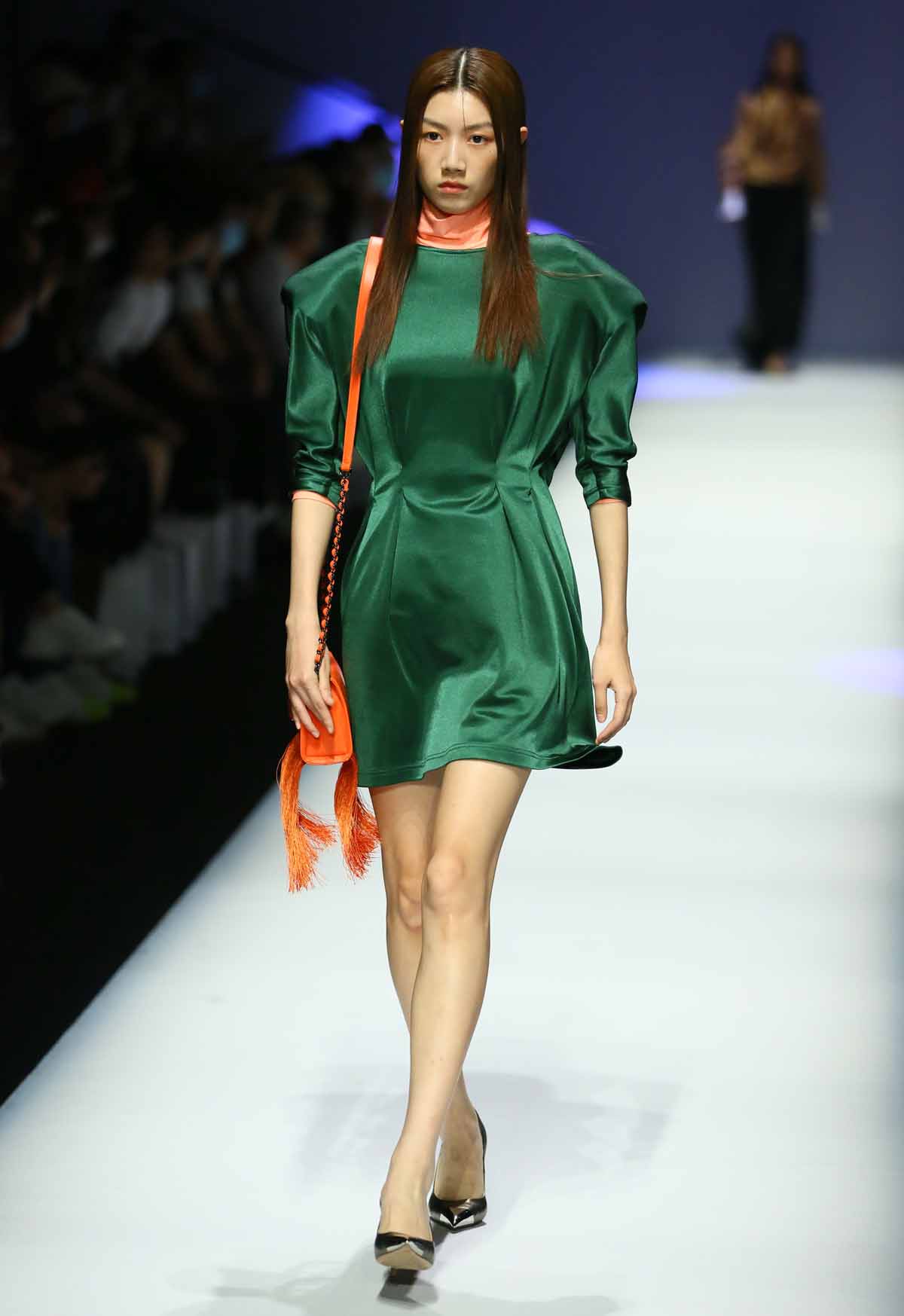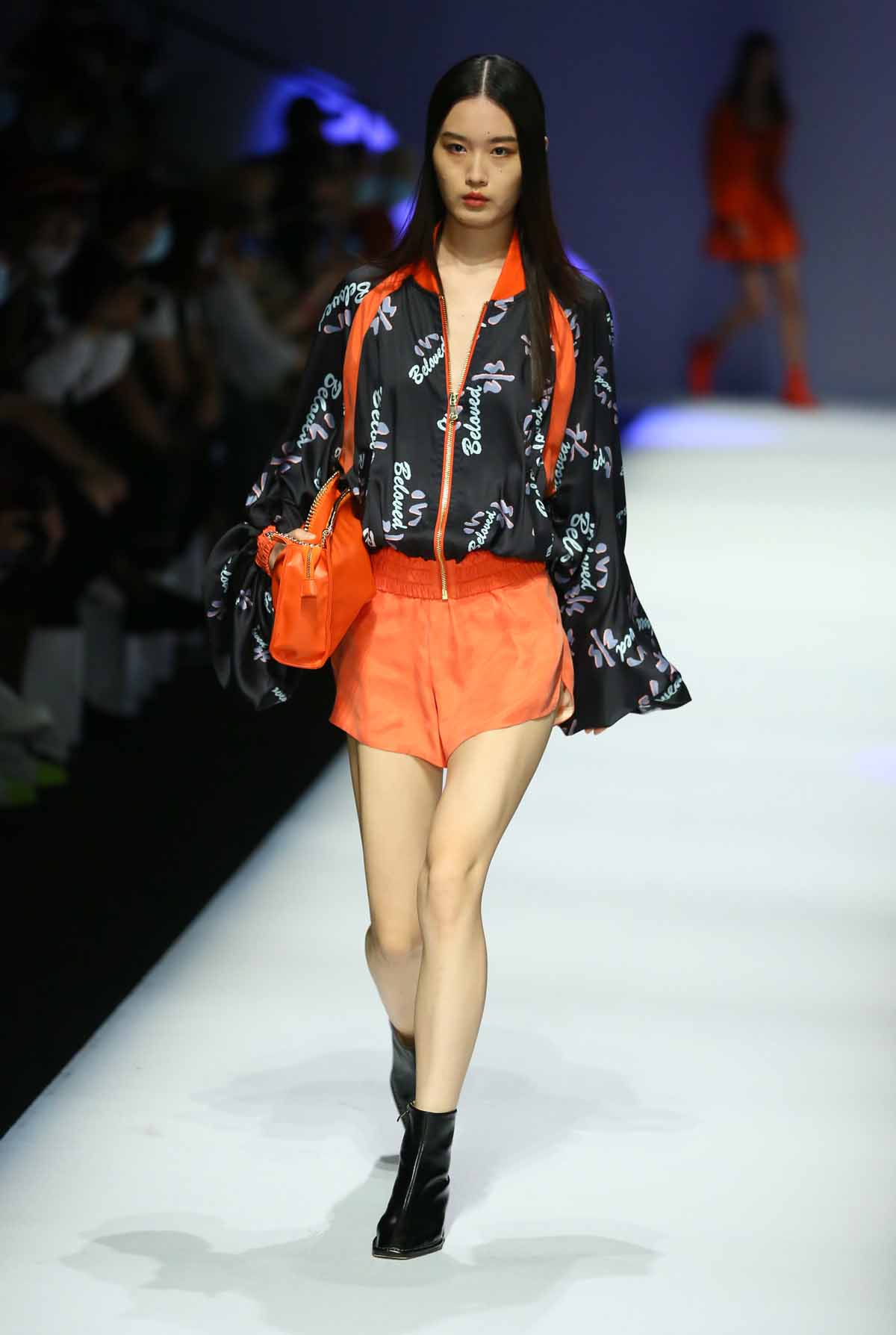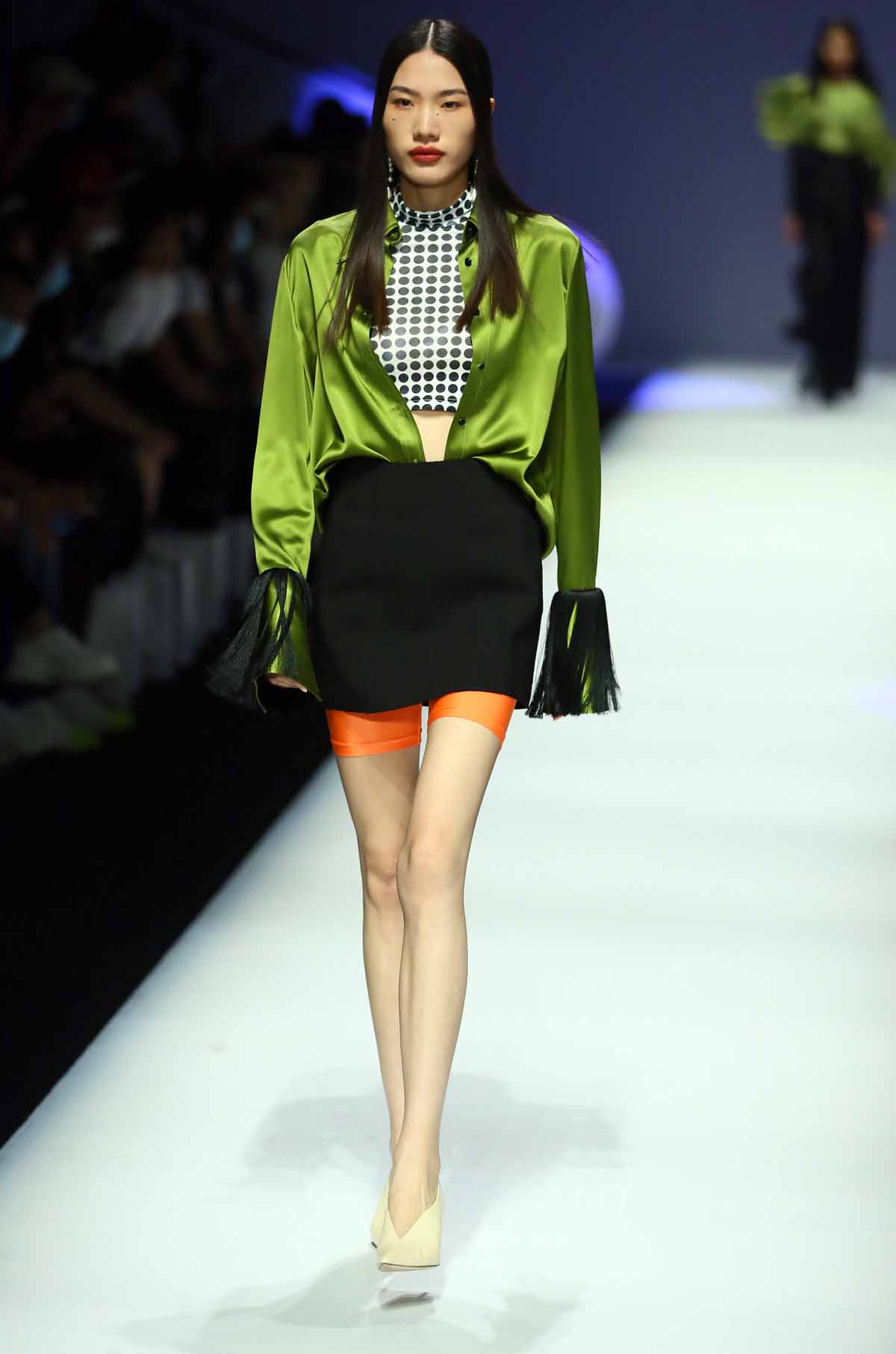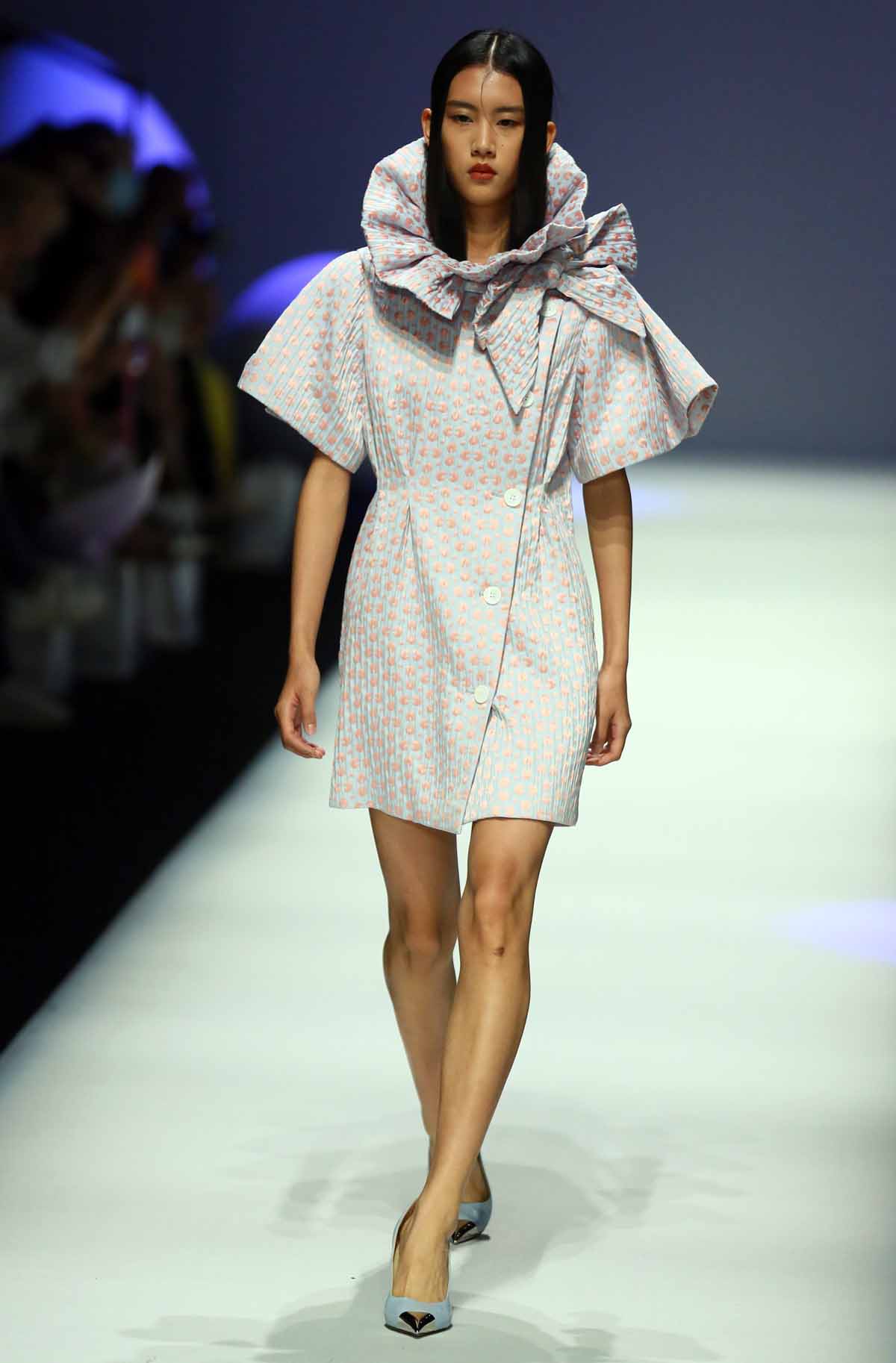 大秀采用“沉浸式走秀”的方式,在现代艺术装置中随性而来,形成与观众对话的共享空间,所有的布置都像是在等待观众的反馈,即刻又融为一体。复古的音乐、低沉性感的唱腔刚好与有趣的服装和谐对话,本季融合70年代复古不羁的风格与新色彩,交织自由与禁锢,摩登与传统,知性与恣意。色彩取于大自然,并以宽松廓形丰富女性线条,化用经典造型,凸显女性的优雅。很难想象邓兆萍“敞开心扉”后的“心水清单”会如此张扬,而且恰到好处地将这种张扬降温于有趣的印花图案中。邓兆萍用手绘抽象画风把“虾饺、烧卖、肠粉”等广府美食和粤语俚语“心水”运用到了设计中,既满足了年轻人“个性决绝”的心理需求,又在细节处用“好玩儿”的随意展现了她心头所好的生活。