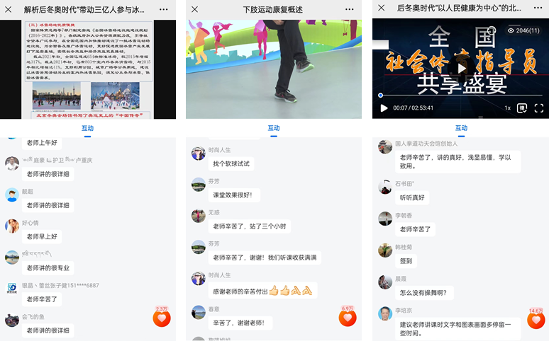 本次线上直播授课安排了社会体育指导员基础知识、基本素养、工作规范和注册方法,后冬奥时代冰雪运动发展,体医融合和科学健身等课程。北京体育大学梁晓杰、邱招义、侯世伦、李松波,首都体育学院赵立、阎守扶、茹秀英、崔玉鹏、刘平江,北京大学第三医院宫萍、康复治疗师吕铮等专家应约授课。同时,邀请长期坚持在基层带领市民健身、发挥作用较好的社会体育指导员代表赵国亚、盛佩华、李玉敏参与,分享工作经验和心得体会。学员和市民们纷纷在直播间留言,课程内容充实、实用,老师讲解深入浅出、通俗易懂,希望以后能多安排一些这样的课程,帮助他们更科学地参与健身运动。