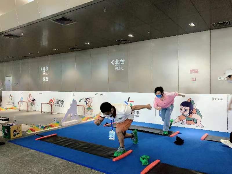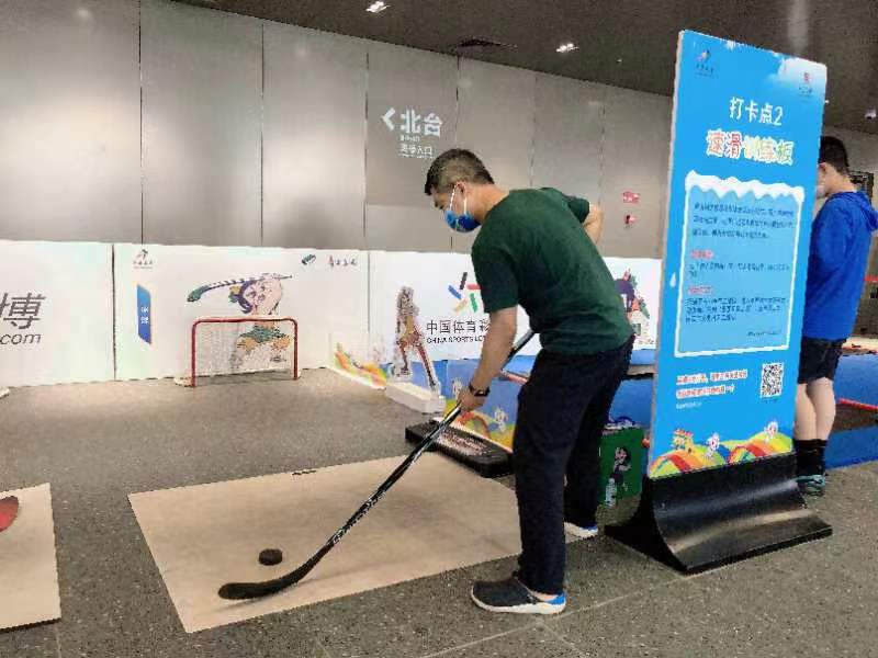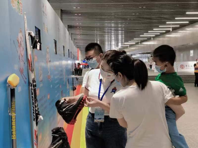 活动现场,搭建的冰雪知识大讲堂展区,通过视频、图文资料和冰雪器材展示系统性的介绍了北京冬奥会15个分项项目和中国冰雪发展历程,引来了不少市民驻足观看。一位现场参与体验的市民说到,在冬奥赛场滑冰,体验了旱地的速滑训练板,还在现场看到了黑龙冰刀,勾起了儿时滑冰的回忆。